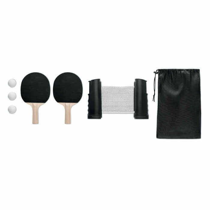 Súprava na stolný tenis s rolovacou sieťkou. Nudíte sa počas pracovnej prestávky? Premeňte svoj pracovný stôl v kancelárii alebo jedálenský stôl doma na súťažnú arénu stolného tenisu. Súprava obsahuje tri loptičky, dve pálky a jednu výsuvnú sieťku. Všetko je dodávané v RPET púzdre. Maximálna dĺžka siete 175 cm bez držiaka.