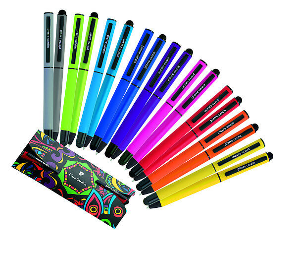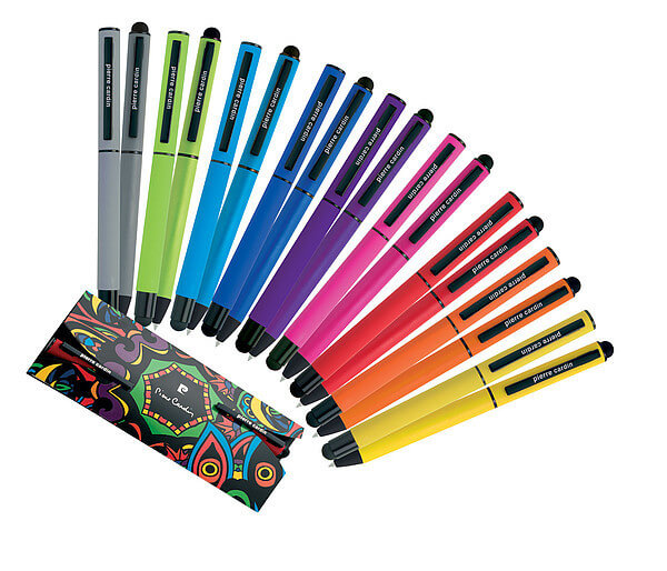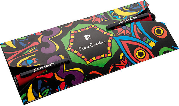 Luxusná sada rollera a guľôčkového pera Pierre Cardin v módnych farbách s hliníkovým telom a gumovou povrchovou úpravou, ktorá je veľmi príjemná na dotyk. Perá majú čierne detaily a stylus. Roller obsahuje modrú náplň značky Schneider s hrotom 0,5 mm, guľôčkové pero kvalitnú modrú náplň s hrotom 0,7 mm. Balené v luxusnom vrecku Pierre Cardin, dodávané s certifikátom pravosti. Rozmery: roller 1 × 13,5 cm, guľôčkové pero 1 × 14 cm, balenie 7 × 15,5 cm.