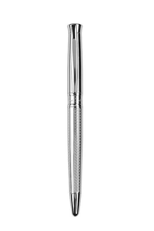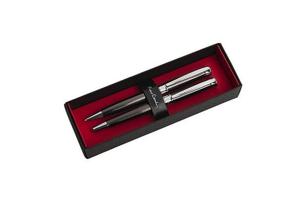 Sada guľôčkového pera a rollera značky Pierre Cardin. Perá majú veľmi elegantný tvar a jemné rytie po celom provrchu. Guľôčkové pero má otočný mechanizmus a obsahuje kvalitnú náplň v modrej farbe s hrotom 1 mm. Roller obsahuje nemeckú náplň značky Schmidt v modrej farbe s hrotom 0,6 mm. Oboje je dodávané s náhradnou čiernou náplňou v luxusnej krabičke Pierre Cardin s certifikátom pravosti.