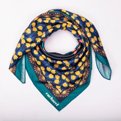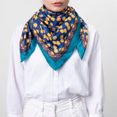 Šatky Albane s ich žiarivou farebnou paletou a luxusnými keprovými textúrami sú inšpirované imaginárnou botanickou záhradou. Táto verzia kombinuje sýtozelený rám so žltými a modrými tónmi. Jeho námornícke akcenty dodávajú elegantný nádych. Ideálne na dodanie žiarivého zavŕšenia akémukoľvek outfitu.t