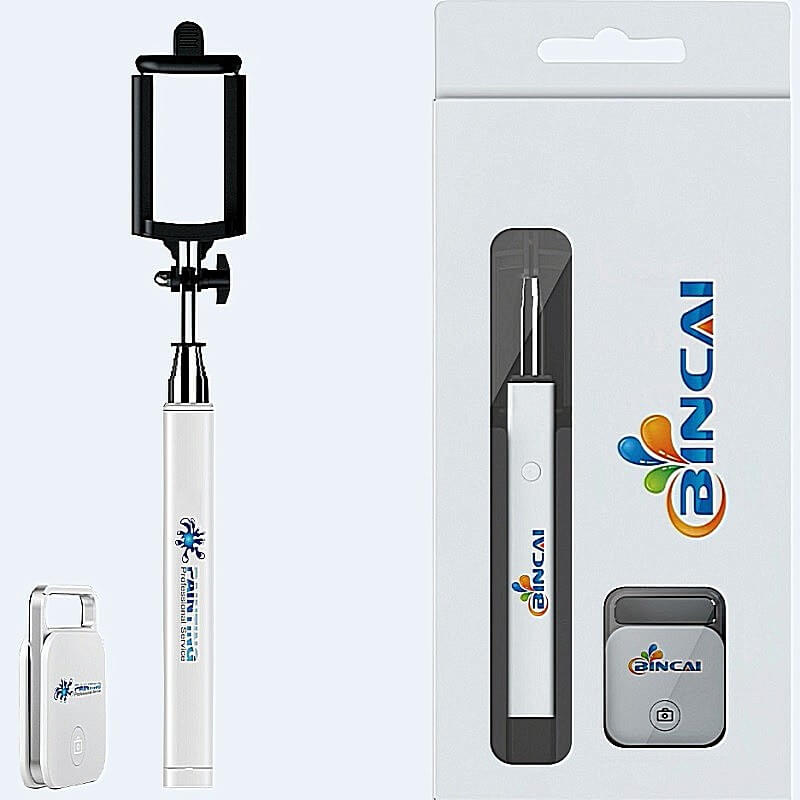 SELFIE SET - Univerzálna Bluetooth spúšť pre mobilné telefóny + selfie tyčka, darčeková krabička. Na vzdialenosť až 10 m môžete ovládať spúšť vo Vašom Smartphone, alebo iPhone a robiť tak fotky v pozíciách, ktoré Vám mobil v ruke nikdy nedovolí. BT spúšť je možné nosiť ako prívesok na kľúče a kedykoľvek okamžite použiť. Dlhá výdrž batérie (cca 6 mesiacov pri použití 10x denne). Balené v darčekovej krabičke spolu so selfie tyčkou. Možnosť CMYK celoplošnej potlače.