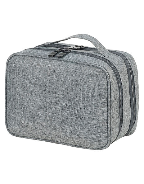 · 100% polyester (600D, melanza) · Praktická toaletná taška · Rukoväť · Hlavná priehradka so zipsom vo vnútri vrecka · Druhá hlavná priehradka s gumičkou na príslušenstvo · Kapacita: 5 litrov · Rozmery: 25 x 12 x 19 cm · Vhodné na prenos, sieťotlač a StickMax. Max. Plocha tlače: 17 x 12 cm.