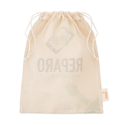 Sieťované bavlnené vrecko na potraviny,na mieru pre čerstvé potraviny, vyrobené zo 100% bavlny. Jedna strana je z bavlny (140 g/m²), ktorú je možné potlačiť celoplošne v požadovanom prevedení. Druhá strana je zo sieťovanej bavlny. Rozmer 30x35cm. Hromadne zabalené (nepoužívajú sa žiadne plasty) a voliteľne každé vrecko môže byť zabalené do papierového obalu s vlastným potlačeným dizajnom. Možno prať v rukách.