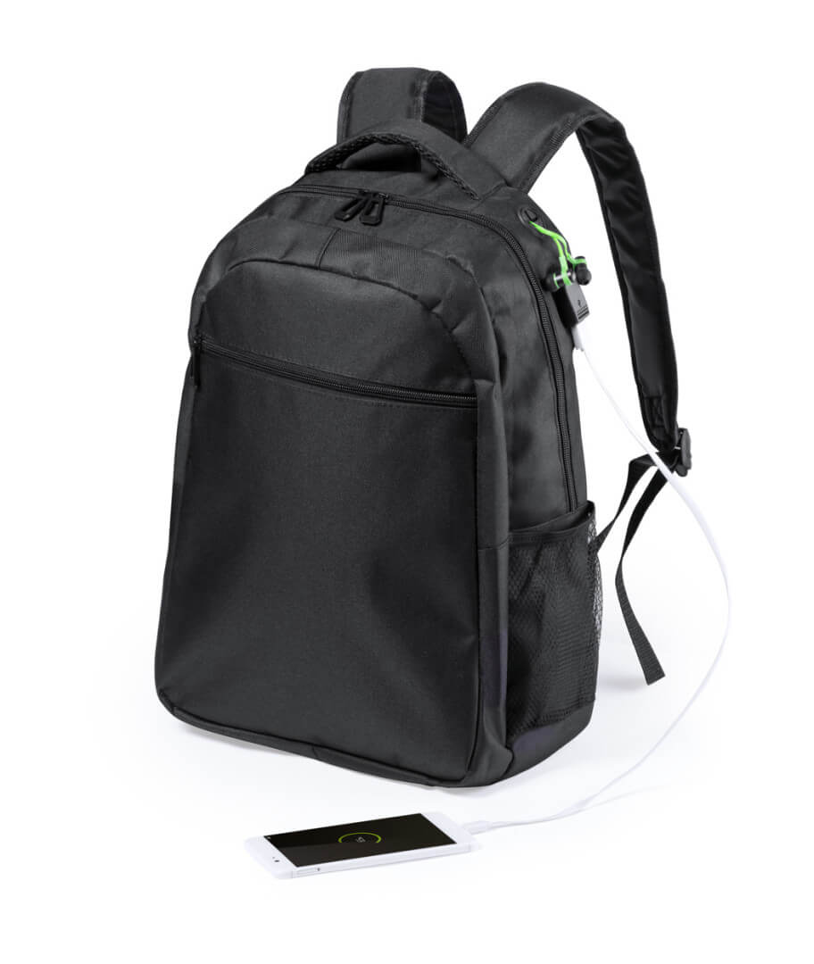 Vodeodolný batoh s priehradkami na zips, vypolstrovanou priehradkou na laptop a tablet, vypolstrované ramenné popruhy. Výstup na slúchadlá a so vstavaným USB pripojením pre power banku. 600D polyester.