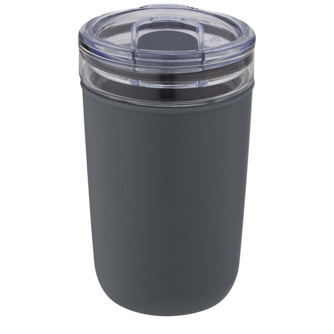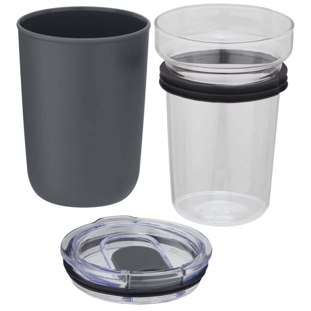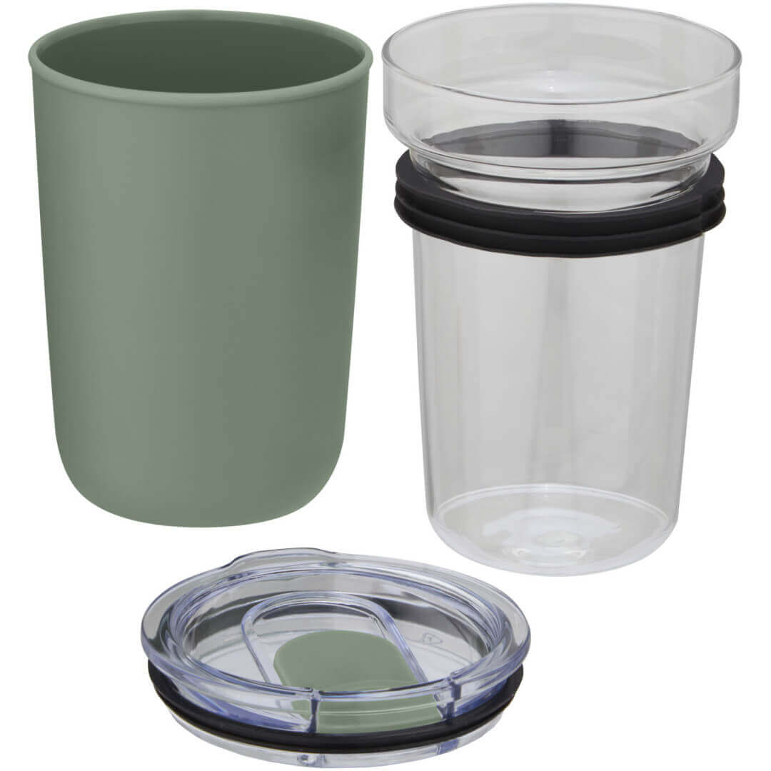 Sklenený kelímok chránený obalom z recyklovaného plastu. Téglik je vyrobený zo 100% odolného borosilikátového skla, ktoré zachováva čerstvosť nápoja a neobsahuje žiadne škodlivé chemikálie. Bez BPA, testované a schválené podľa nemeckej legislatívy o bezpečnosti potravín (LFGB). Testované a schválené na obsah ftalátov podľa predpisov REACH. Téglik sa zmestí pod väčšinu kávovarov. Objem je 420 ml. Po sňatí plastového puzdra je možné umývať v umývačke. Dodáva sa v darčekovej krabičke z recyklovanej lepenky.