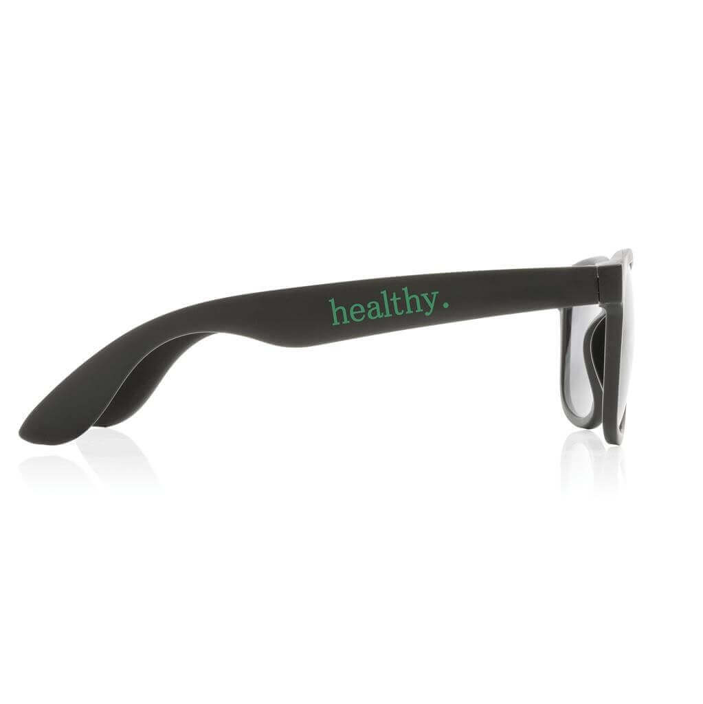Slnečné okuliare vyrobené z GRS recyklovaného PP plastu. GRS (Global Recycle Standard) je globálny štandard, ktorý umožňuje overiť použitie recyklovaného materiálu v produkte naprieč celým dodávateľským reťazcom. Celkový podiel recyklátu podľa váhy produktu: 66 %. Samostatný rám je vyrobený zo 100% recyklovaného PP plastu. Zatmavené akrylové sklíčka sú v súlade s EN ISO 12312-1, UV 400 a CAT 3. Balené v FSC® kraftovej darčekovej krabičke.