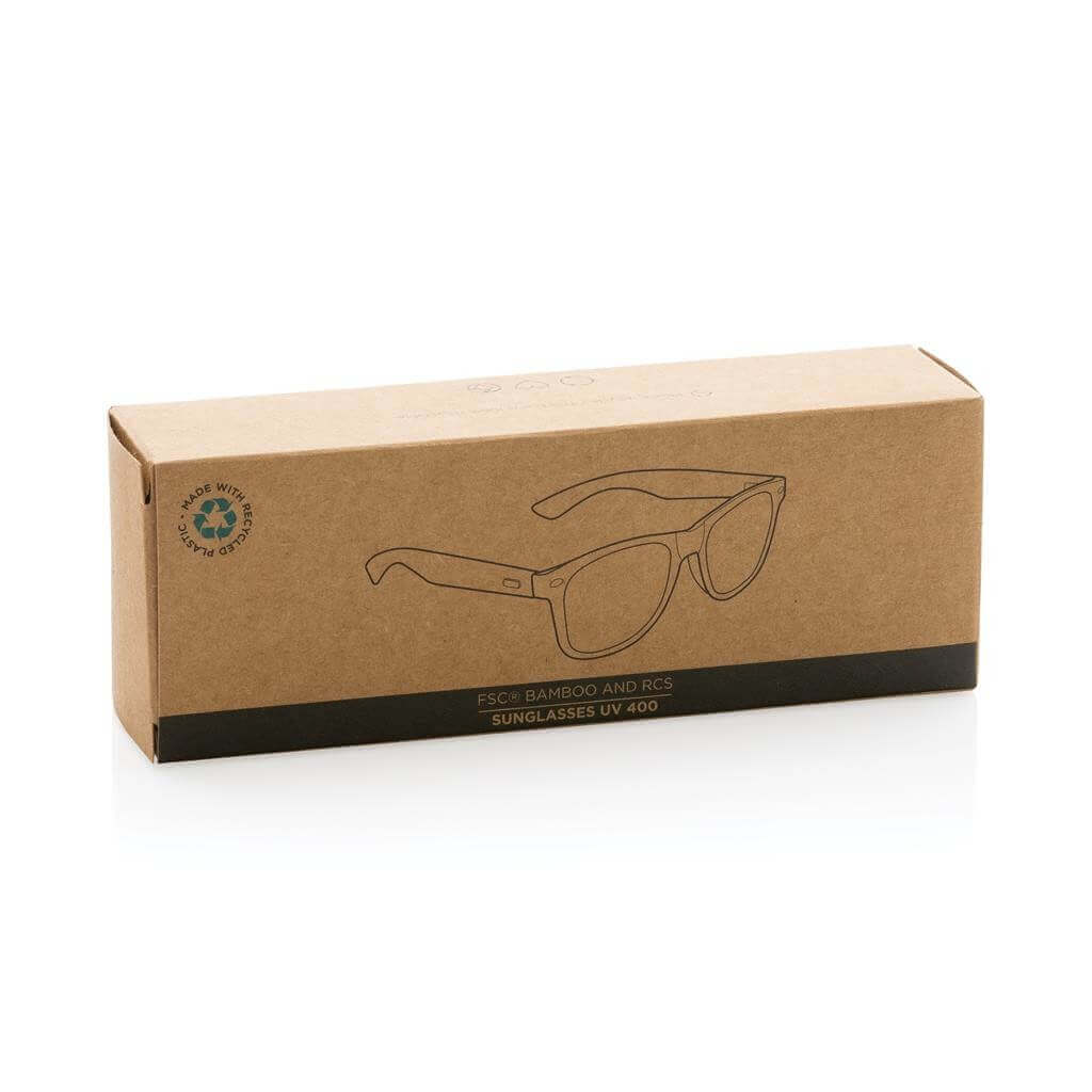 Slnečné okuliare vyrobené z kombinácie RCS recyklovaného PC a FSC® bambusu. RCS (Recycled Claim Standard) je globálny štandard, ktorý umožňuje overiť použitie recyklovaného materiálu v produkte naprieč celým dodávateľským reťazcom. Celkový podiel recyklátu podľa váhy produktu: 41 %. Samostatný rám je vyrobený zo 100% recyklovaného PC. Zatmavené akrylové sklíčka sú v súlade s EN ISO 12312-1, UV 400 a CAT 3. Balené v FSC® kraftovej darčekovej krabičke.