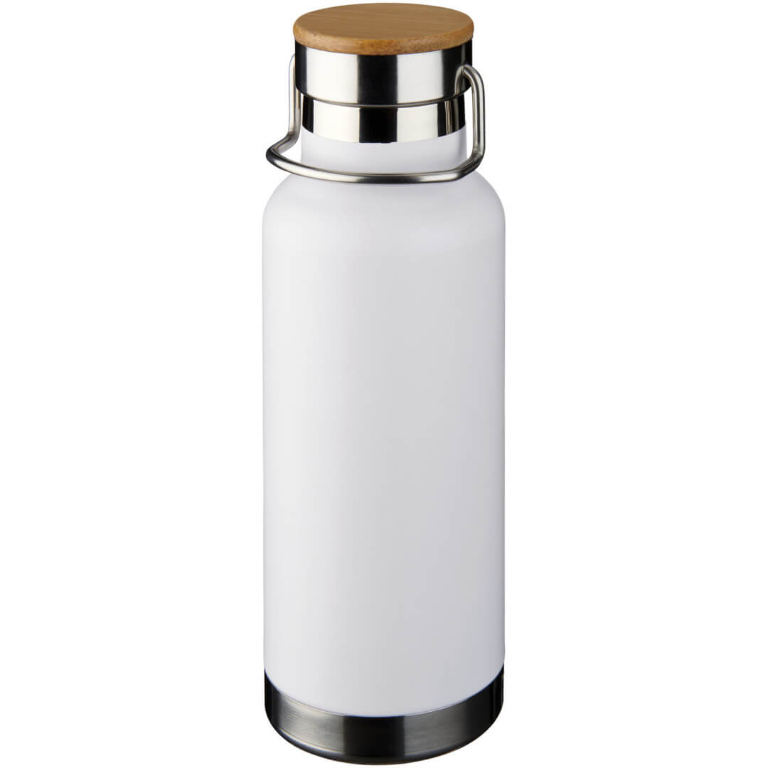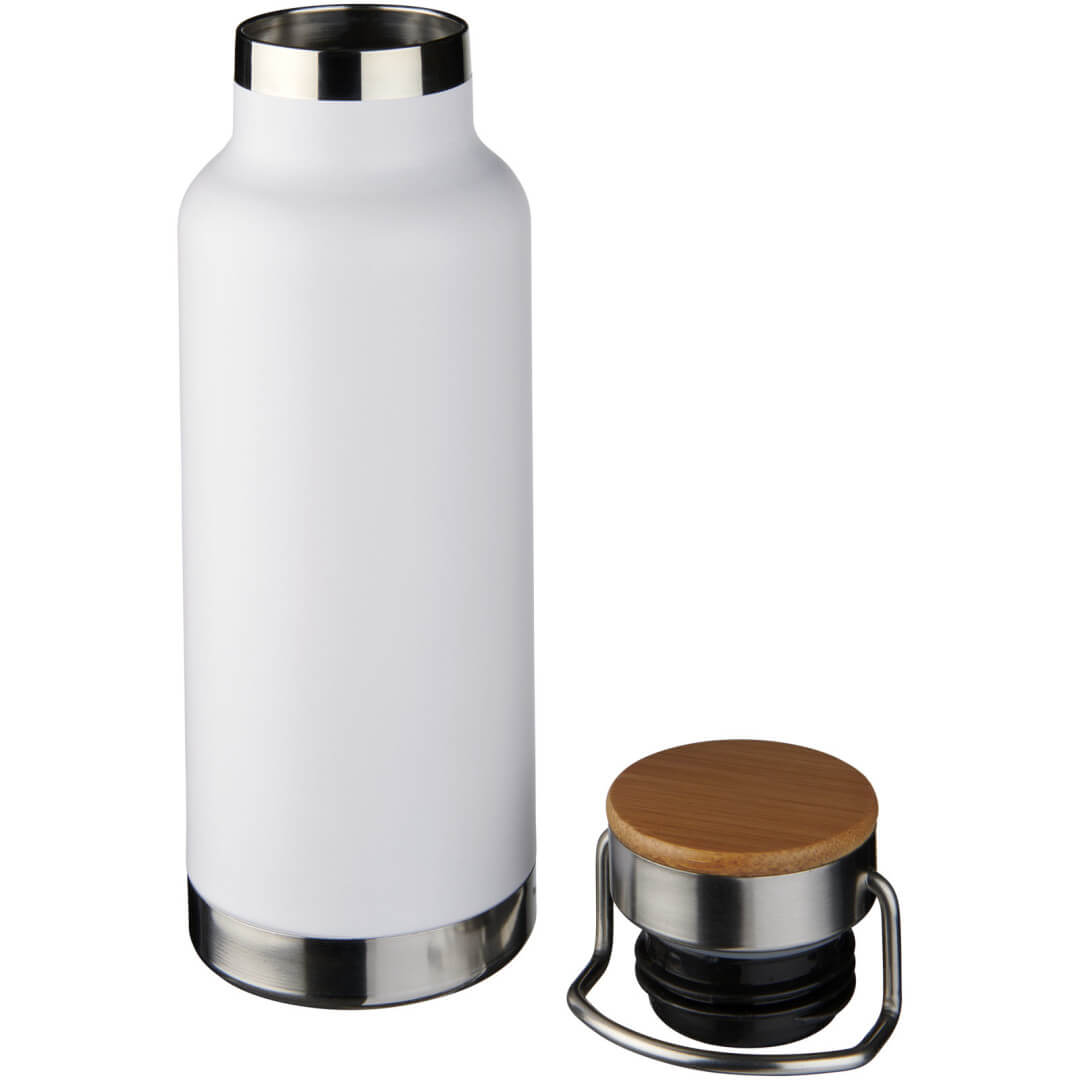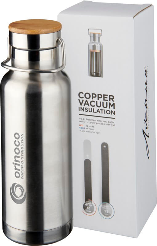 Medená športová fľaša Thor 480 ml s vákuovou izoláciou. Fľaša z nerezovej ocele, neobsahuje plasty. Konštrukcia s vákuovou dvojitou stenou z nerezovej ocele s medenou izoláciou, vďaka ktorej zostanú nápoje chladné po dobu 48 hodín alebo horúce po dobu najmenej 12 hodín. Vďaka tejto konštrukcii tiež na vonkajších stenách nekondenzuje vlhkosť. Skrutkovací uzáver s drevenými detailmi. Práškovo lakovaná s odolnou trendy povrchovou úpravou. Objem 480ml. Dodáva sa v darčekovej krabičke Avenue. Nerezová oceľ.