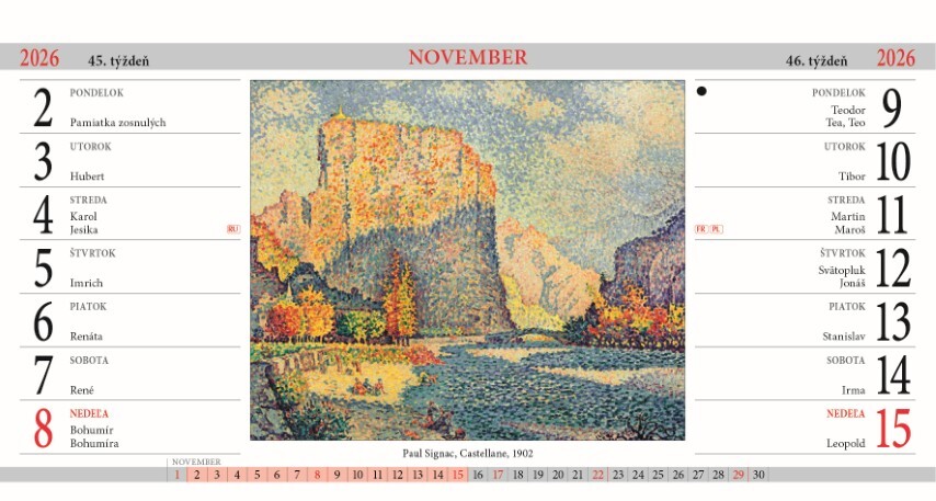 Vneste do svojich dní farbu, svetlo a umeleckú náladu! Stolový dvojtýždenný kalendár predstavuje výber ikonických diel impresionistických maliarov, ako sú Claude Monet, Pierre-Auguste Renoir.. Každý týždeň vás poteší umeleckou reprodukciou s názvom diela a menom autora, vďaka čomu kalendár spája praktické plánovanie s kultúrnym zážitkom. Jemné ťahy štetca, hra svetla a atmosféra prírody či každodenného života vám spríjemnia každý pracovný aj voľný deň. Perfektný darček pre milovníkov umenia a estetiky, ktorí chcú mať kúsok galérie každý deň na dosah ruky.