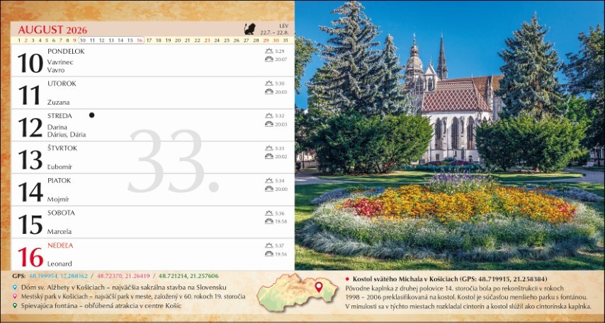 Objavujte krásy Slovenska priamo zo svojho pracovného stola! Tento praktický týždňový riadkový kalendár vás každý týždeň zavedie do iného kúta našej krajiny. Inšpiratívne tipy na výlety, zaujímavosti a menej známe miesta vám pomôžu naplánovať si nezabudnuteľné cesty za poznaním. Ideálny pre všetkých milovníkov cestovania, prírody a slovenských pamiatok – spoznajte Slovensko tak, ako ho ešte nepoznáte!