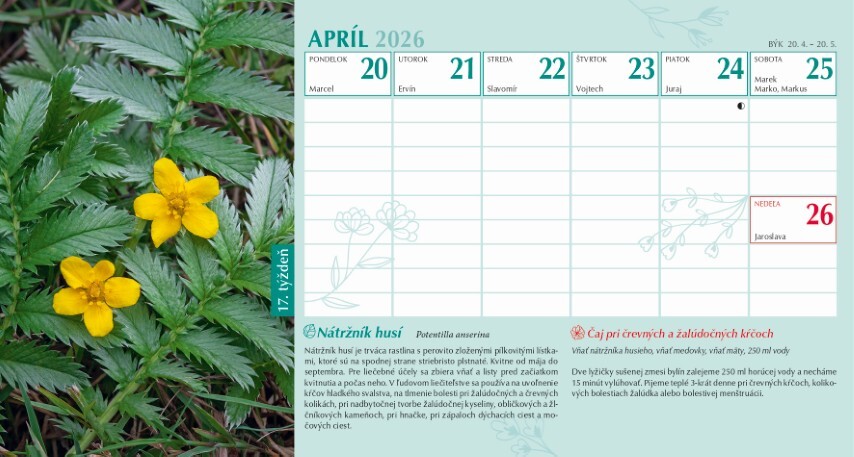 Inšpirujte sa silou prírody po celý rok! Každý týždeň Vám tento kalendár prinesie užitočné rady, prírodné tipy a recepty na podporu zdravia, vychádzajúce z tradičnej ľudovej múdrosti a liečivých účinkov rastlín. Praktické tipy sú doplnené o fotografie a odporúčania na jednoduché použitie v každodennom živote.