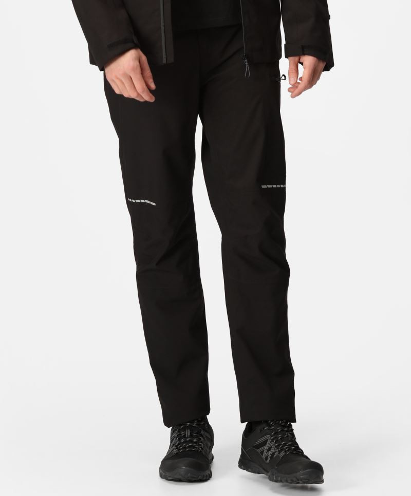 Vodeodolná (10.000mm vodný stĺpec), priedušná (10.000g/m² za 24h), čiastočne elastický pás, ľahko tvarované kolená, 1 našité zadné vrecko, 2 vrecká na zips, 1 vrecko na nohavici, podlepené švy, 4-cestný streč detail