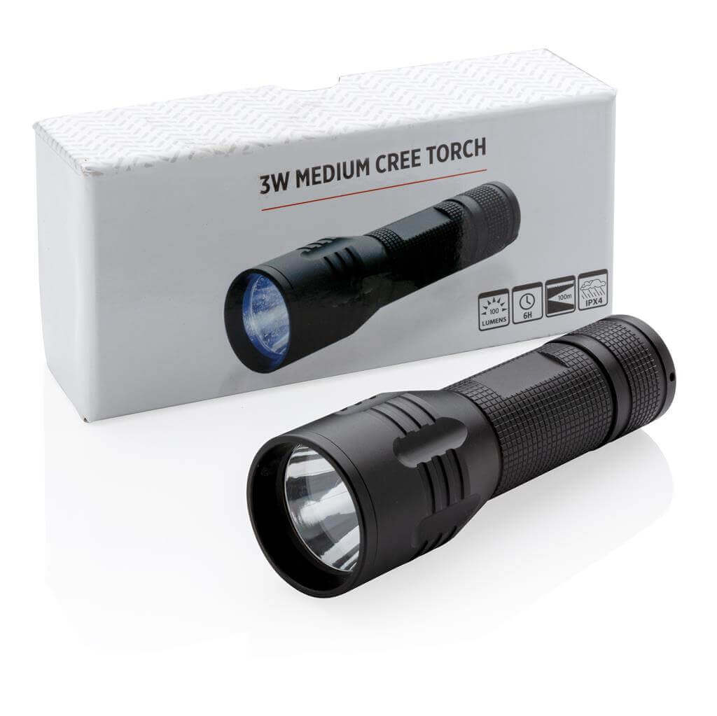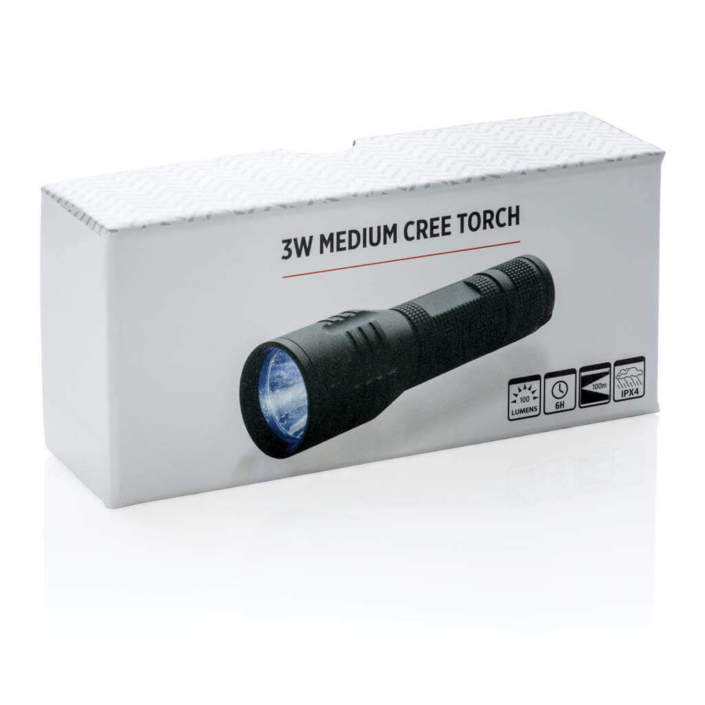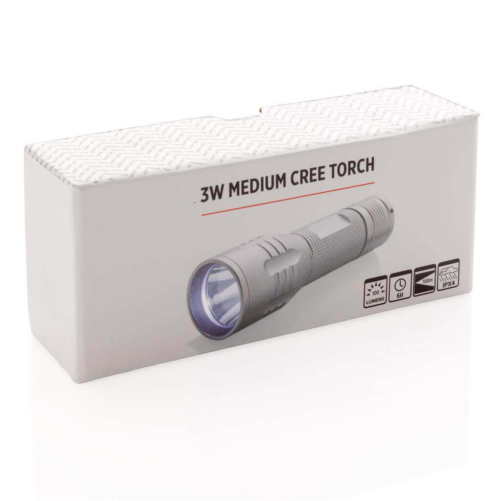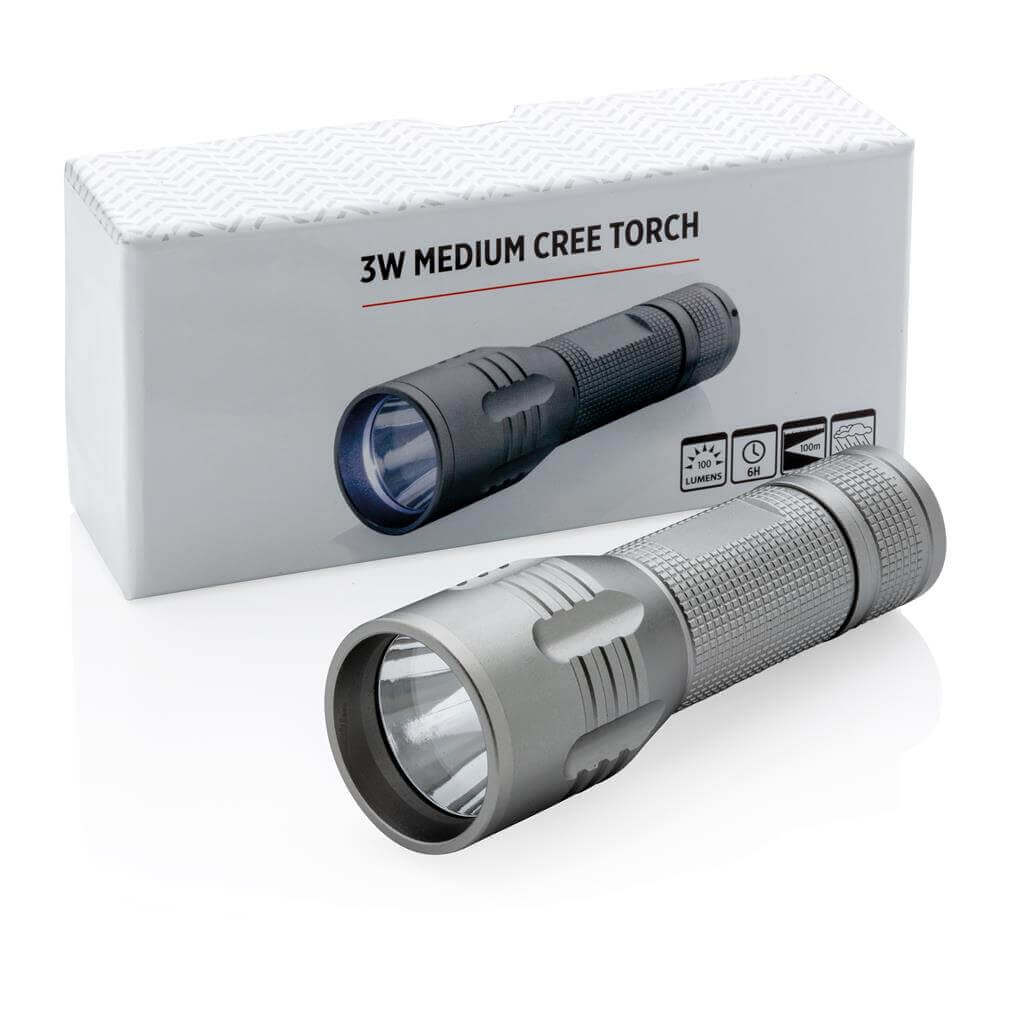 Silné 3W CREE svietidlo s dlhou výdržou. Špeciálna technológia CREE LED zaisťuje mnohonásobne vyššiu svietivosť v porovnaní s bežným LED svetlom. 100 lumenov, prevádzková doba okolo 6 hodín. Vyrobené z odolného hliníka. Vrátane batérií pre okamžité použitie. 3 batérie typu AAA súčasťou balenia.