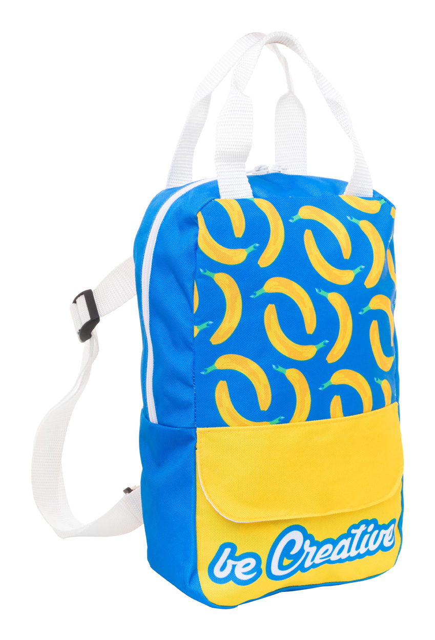 Mini RPET batoh vyrobený na zákazku s hlavnou priehradkou na zips a predným vreckom so zapínaním na patentky. S celoplošnou sublimačnou tlačou nezahŕňa tlačovú prípravu. 600D RPET polyester s výrazným štítkom RPET. Min. mn.: 25 ks.