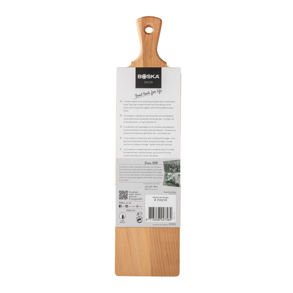 Táto kompletná sada na syr obsahuje servírovaciu doštičku z bukového dreva a tri nože Copenhagen. Nože sú ľahké, dajú sa umývať v umývačke riadu a sú ideálne na krájanie všetkých druhov syrov. Doštička je vhodná iba na ručné umývanie. S 10-ročnou zárukou.