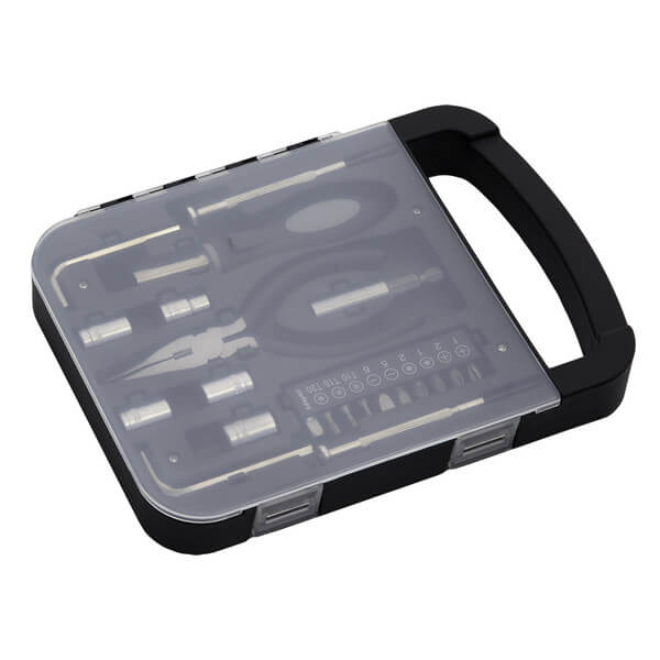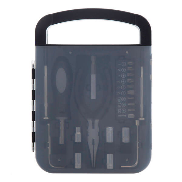 Sada náradia z ocele a plastu s 21 funkciami: krížový skrutkovač, plochý skrutkovač, adaptér (¼"), Torx kľúč (ružicový) – 3 veľkosti, ploché skrutkovače – 2 veľkosti, PZ skrutkovače – 2 veľkosti, krížové skrutkovače – 2 veľkosti, inbusový kľúč – 2 veľkosti, očkový kľúč – 5 veľkostí, kombinačné kliešte, univerzálny magnetický držiak na skrutkovač (¼"), 35 mm nadstavec na skrutkovač (¼"). Balené v obale z plastu s rukoväťou.