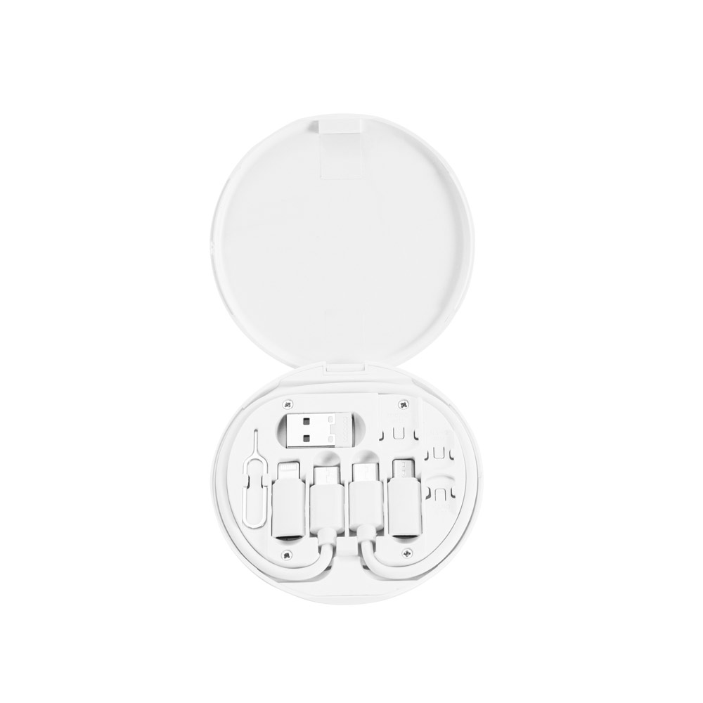 Súprava superrýchleho nabíjacieho kábla a adaptéra vyrobená z recyklovaného ABS-a (100% rABS). Obsahuje 28.5 cm kábel USB-C na USB-C, ktorý podporuje superrýchle nabíjanie až 60 W a prenos dát, adaptér USB-C/USB-A, adaptér USB-C/Micro USB a adaptér USB-C/Lightning. Obsahuje tiež časť na vyberanie SIM karty a 2 sloty na uloženie kariet Nano a Micro SIM. Dodávané v darčekovej krabičke z kraftového papiera. 57 x 26 mm | Obal: 84 x 11 x 85 mm
