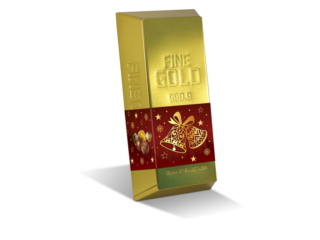 Plechová dóza v tvare zlatej tehličky ukrýva talianske pralinky s krémovou lieskovoorieškovou náplňou – darček s iskrou.