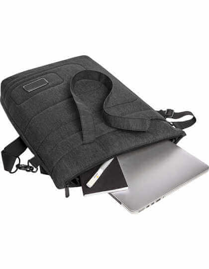 Dokonale prešitá predná strana s plastovým štítkom pre vaše logo. Hlavná priehradka na zips s priehradkou na notebook. Dve sieťované vrecká. Vnútri veľký sieťovaný priestor na zips. Ploché vrecká s vonkajším magnetickým uzáverom.