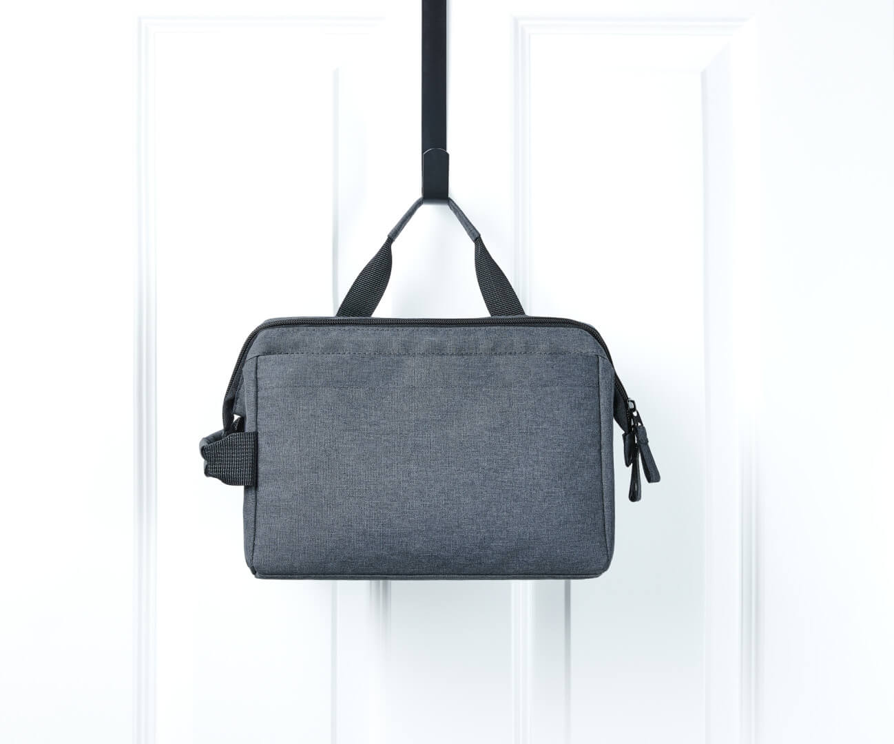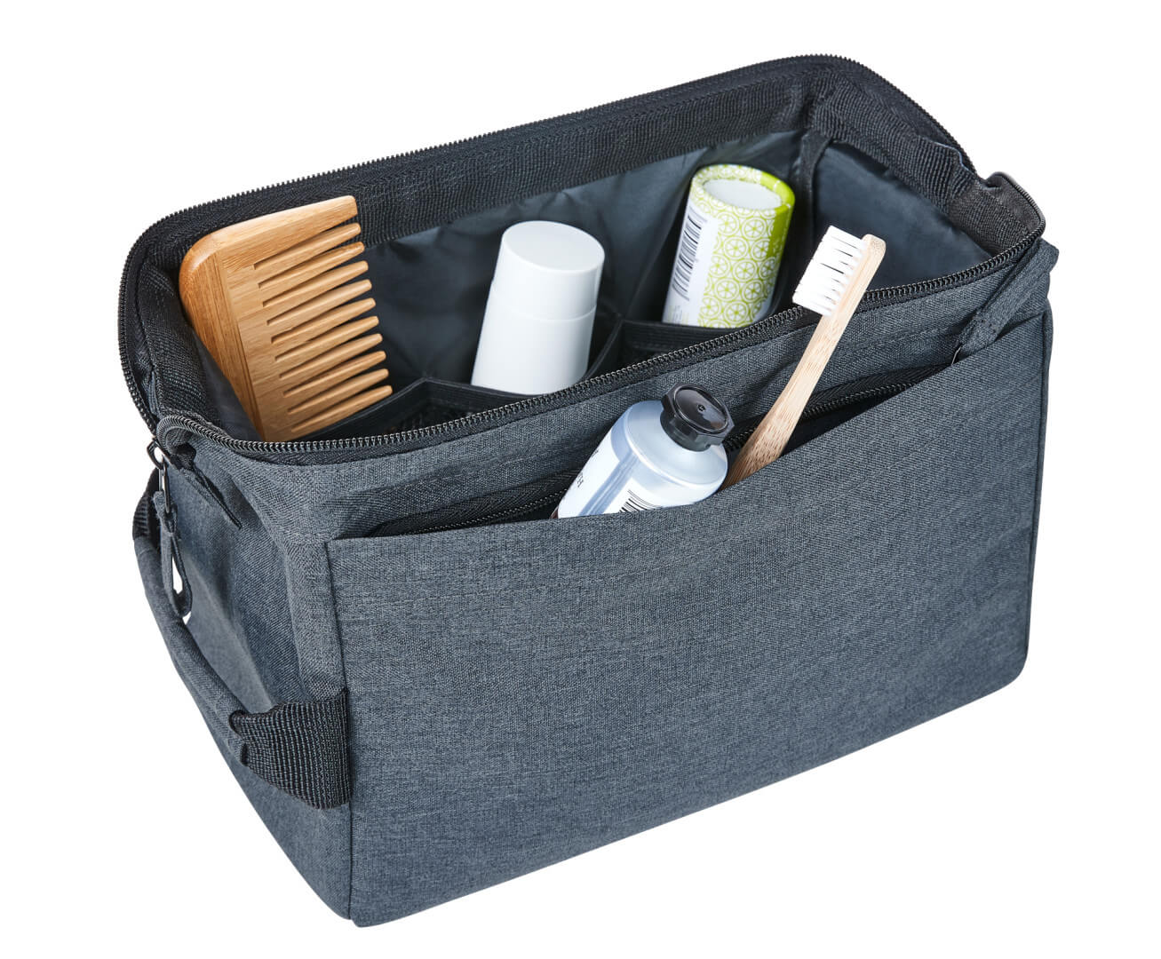Vrecko na zips s robustným kovovým rámom na zavesenie alebo státie | Vrchný materiál rPET, 300D | Veľký, polstrovaný hlavný oddiel s rôznymi organizačnými prvkami | Predné vrecko na zips | Ucho | Bez PVC | Obsah/dekorácia nie sú súčasťou balenia