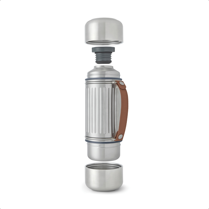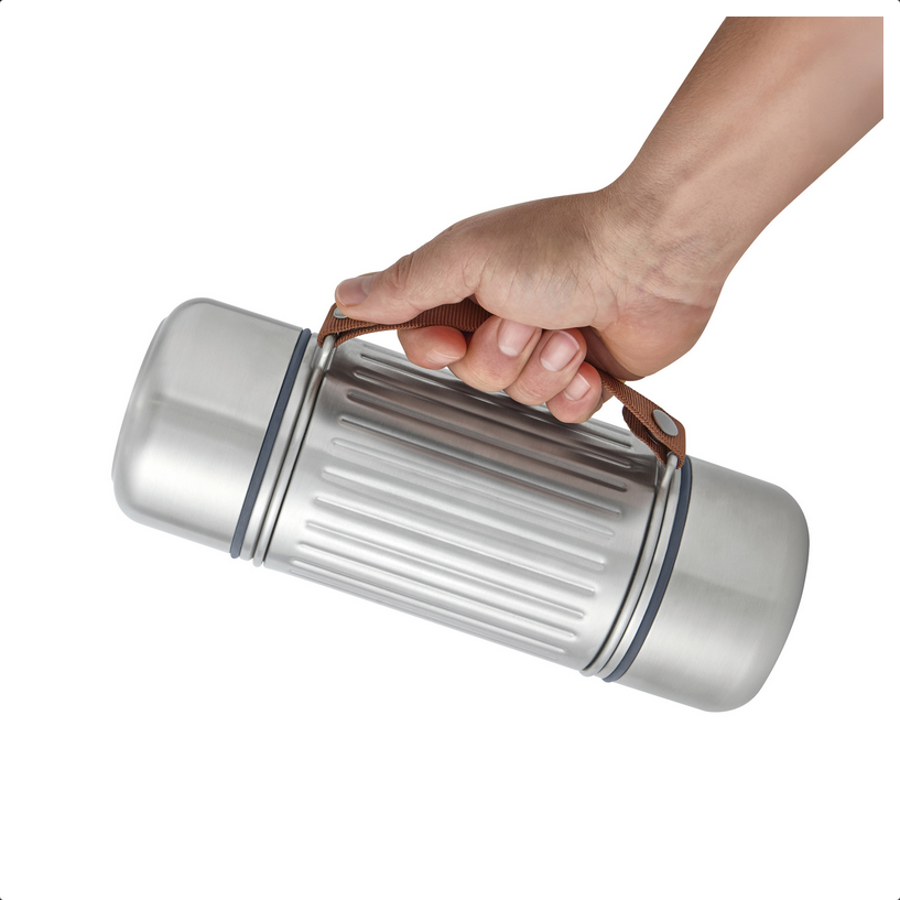 Tento 1l vákuovo izolovaný nerezový termohrnček je vhodný na túry, pláž aj zjazdovky. Vďaka pevnej konštrukcii udržia nápoje teplé alebo studené až 24 hodín. Je nepriepustný, má oceľové viečko s jednoduchým nalievaním a dve dvojito stenové nerezové šálky. Šálky so širokým dnom sú stabilné na nerovnom povrchu, nylonový popruh uľahčuje prenášanie. Silikónové tesnenie zabraňuje kvapkaniu a po sňatí popruhu je možné termofľašu umývať v umývačke.