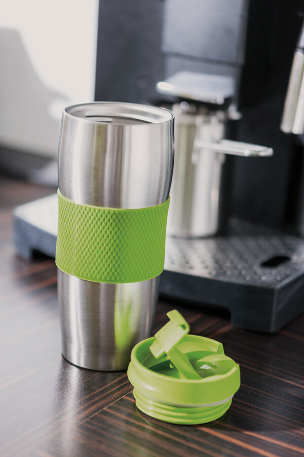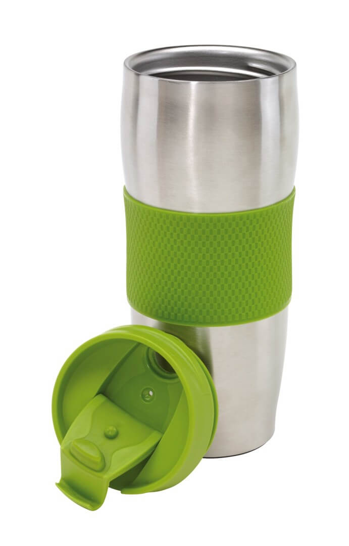 Termohrnček s dvojitou stenou z nerezovej ocele, má farebné skrutkovacie plastové veko s otvorom pitie, farebný gumový krúžok pre lepšiu priľnavosť a pogumovaným podstavcom pre dobrú povrchovú priľnavosť, cca. 380 ml, balené v darčekovej krabičke.