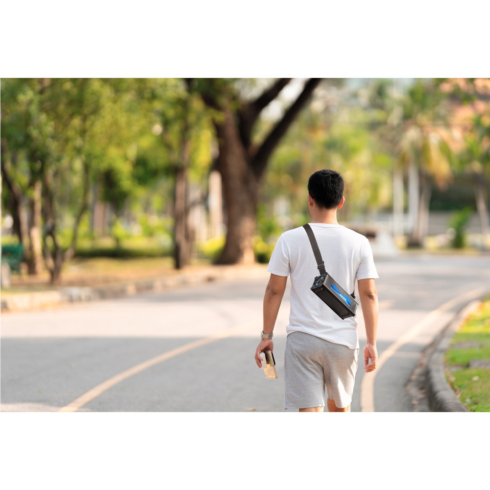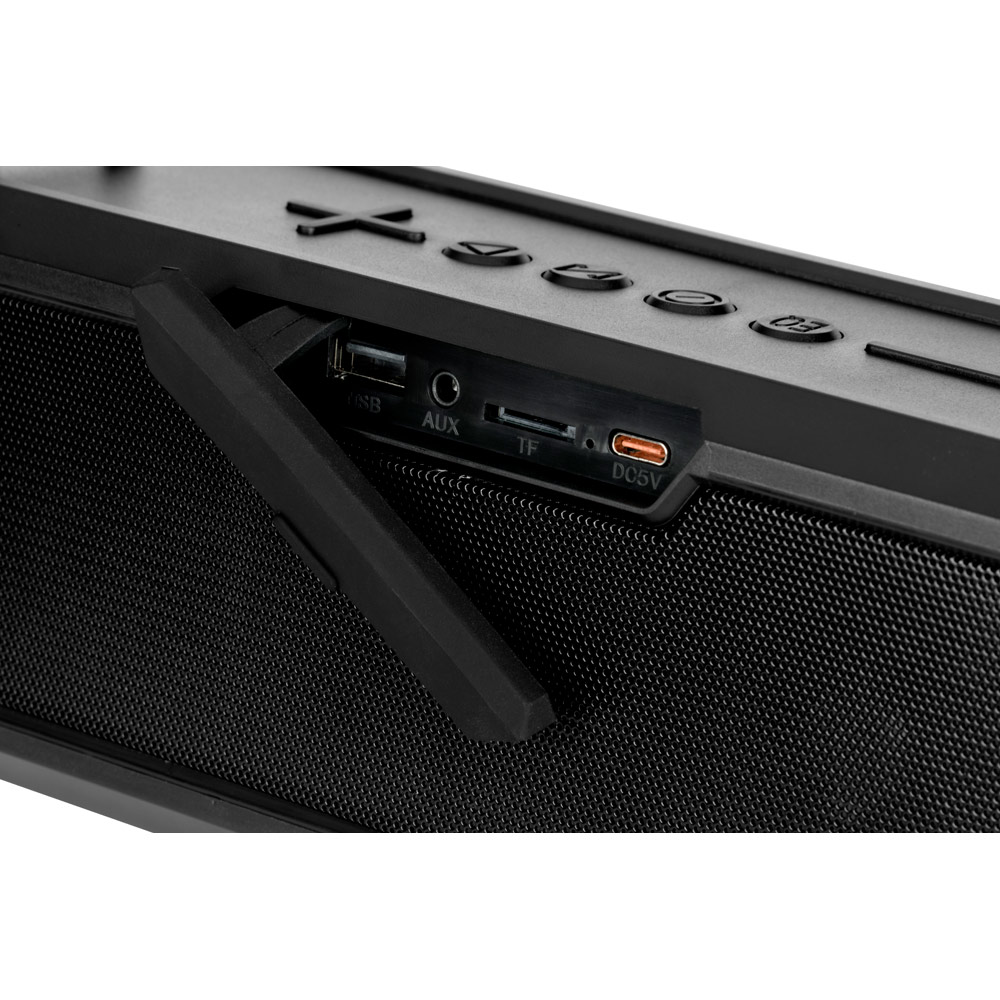 Prenosný reproduktor ABS. S bezdrôtovým prenosom BT v5'0, ekvalizérom so 4 prednastavenými režimami, USB-A vstupom a 3.5 mm pomocným vstupom. So zvukovým výkonom 16W (2x 8W) a veľkou 3 000 mAh batériou poskytuje približnú výdrž batérie 5 hodín a funguje ako power banka cez USB-A port. Priložený popruh na prenášanie umožňuje jednoduché a bezpečné prenášanie alebo zavesenie reproduktora. Hlasitosť a zoznam skladieb môžete ovládať z mobilného zariadenia. Veľké mriežky umožňujú väčšiu oblasť prispôsobenia. Obsahuje nabíjací kábel USB-C a 3.5 mm audio kábel. Dodávané v bielej darčekovej krabičke. 250 x 100 x 90 mm