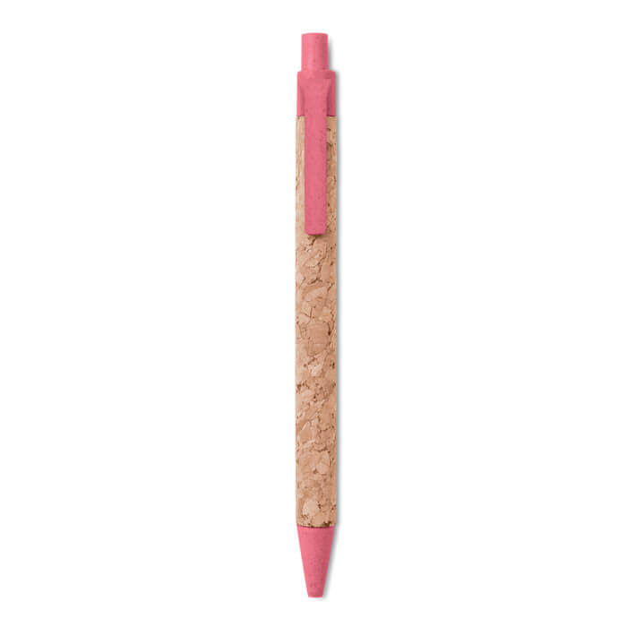 Tlačidlové guľôčkové pero s korkovým telom a časťami z ekologickej pšeničnej slamy (50 %) a ABS plastu (50 %). Modrý atrament. Korok je prírodný materiál, vzhľadom na jeho štrukturálnu povahu a pórovitosť povrchu môže mať konečný výsledok tlače na položku odchýlky.