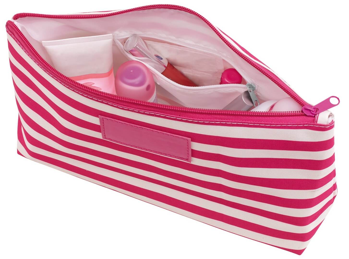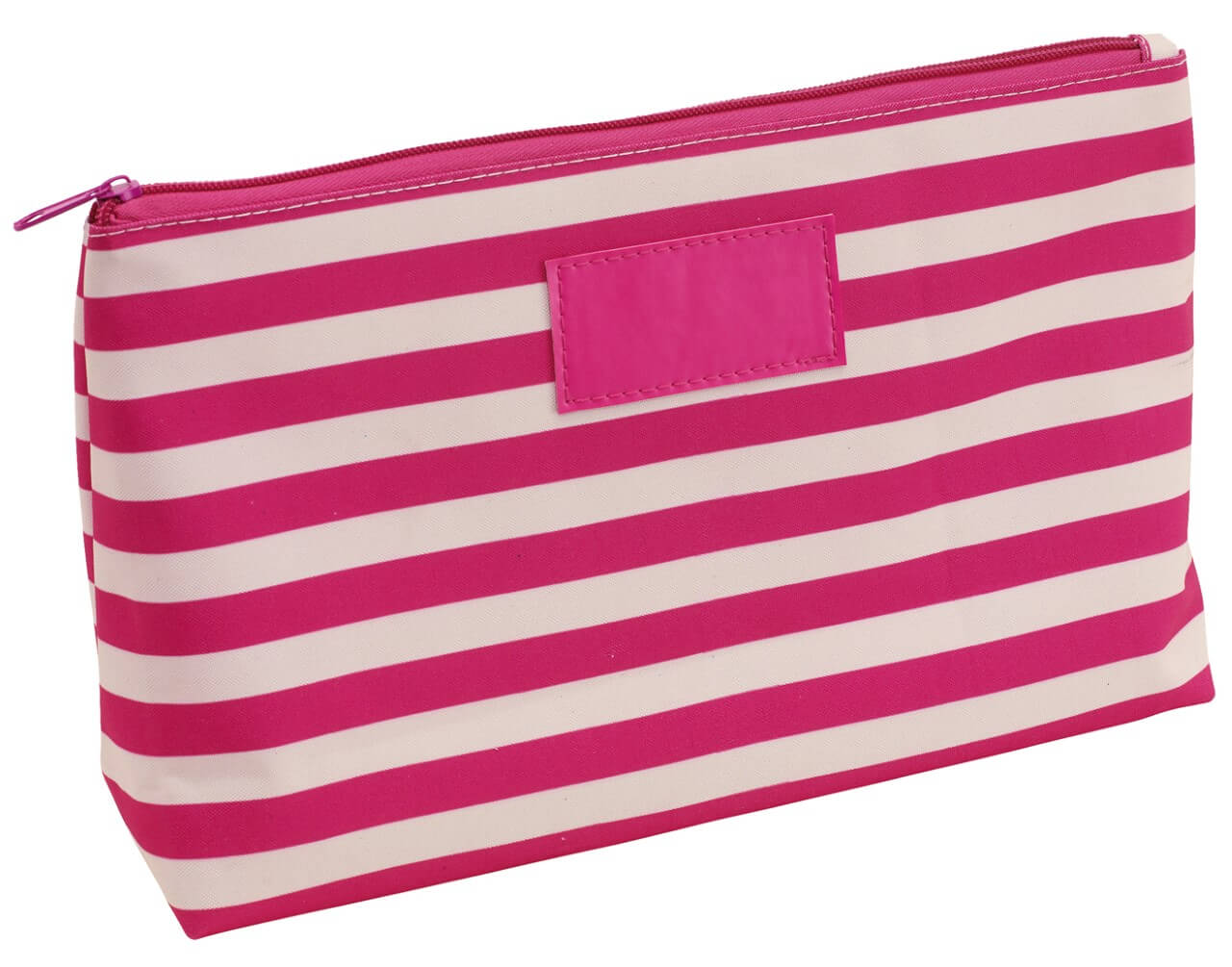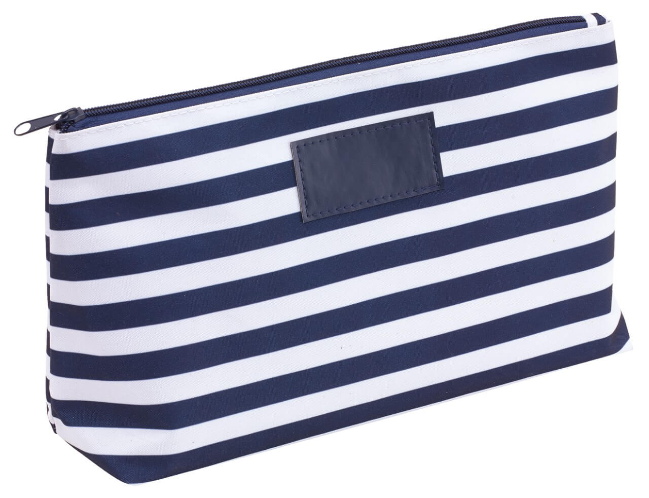Toaletná taška STRIPY : hlavná priehradka na zips, malé vrecko na zips vo vnútri, s námorníckymi pruhmi a s koženkovým štítkom na prednej strane pre umiestnenie reklamy - ideálne pre kozmetiku a kozmetické výrobky, 300D Polyester