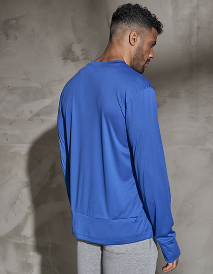 Voľný športový strih | Otvory na palce | Zadné vrecko na zips v páse | Ľahká hladká tkanina NeotericTM od AWD s odvodom vlhkosti a rýchloschnúcimi vlastnosťami | Spevňovacia páska za krkom z rovnakej látky | Detail dvojitého prešitia | Okrúhly výstrih z rovnakej látky | Detail reflexného pútka | Vsadené dlhé rukávy.