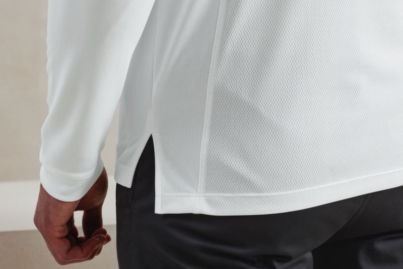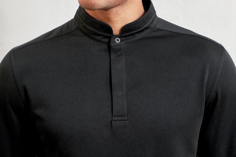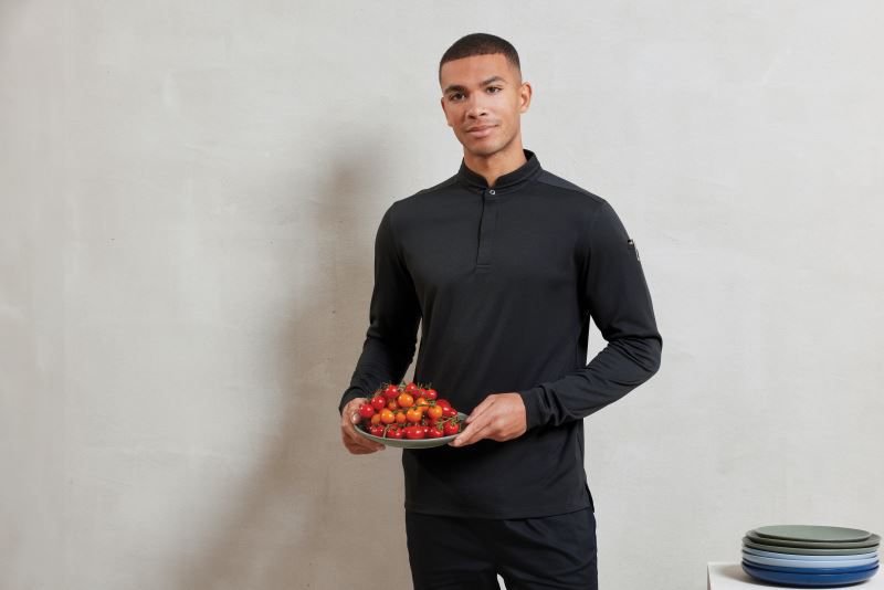 Priedušný materiál regulujúci vlhkosť, mandarín golier, krčná lemovka, pútko s cvokom na zadnej strane krku pre pripevnenie zástery, rebrované manžety, skrytá gombíková léga so zapínaním na cvoky, vrecko na pero na rukáve, priehradka na pero, bočné rázporky, sieťované vsadka na chrbte, prateľné na 60 °, možno sušiť v sušičke pri nízkej teplote, vhodné pre gastronómiu, catering a kuchyne.