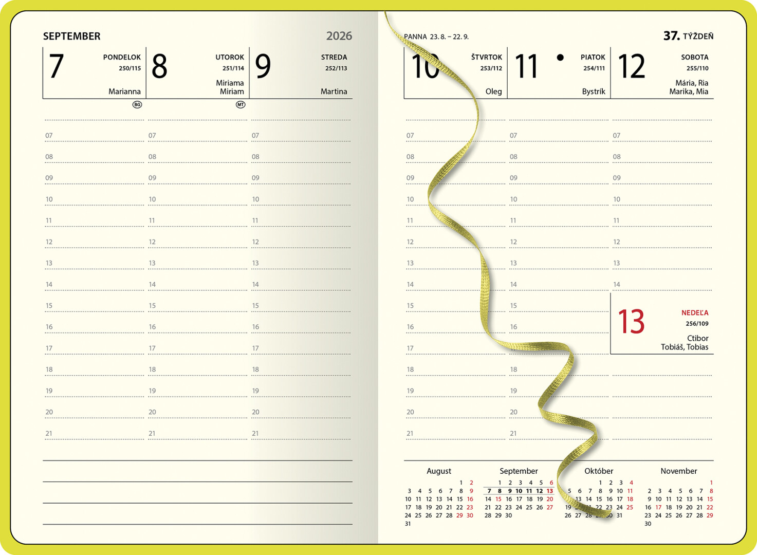 Štýlový týždenný diár v oranžovej farbe s prehľadným kalendáriom na celý týždeň. Diár má praktickú flexi väzbu. Stredom diára je gumička prichytená o kovový úchyt. Obsahuje slovenské kalendárium.