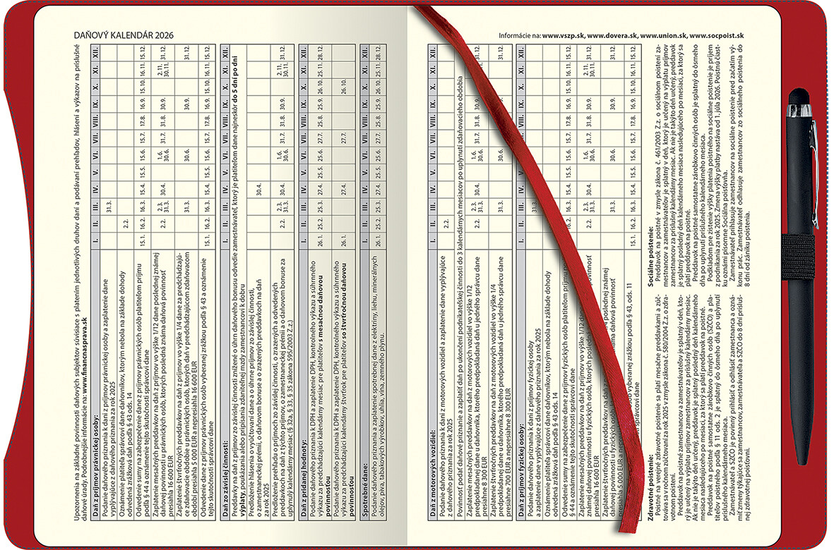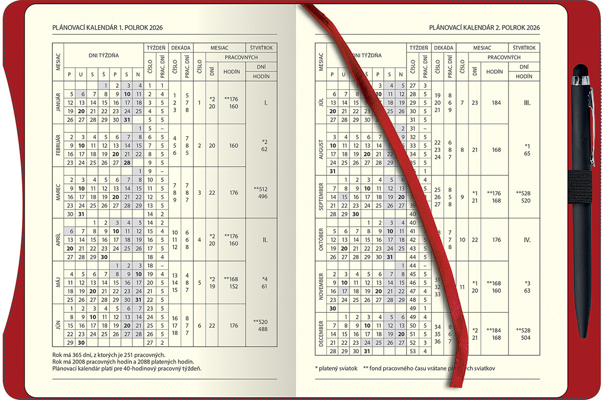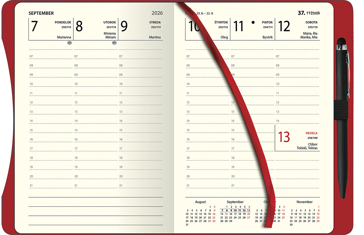 Obľúbený týždenný stĺpcový diár s prehľadným kalendáriom na každý týždeň s pútkom a vloženým perom. Diár je v pevnej väzbe z pogumovaného poťahu s razbou roka. Obsahuje slovenské kalendárium.