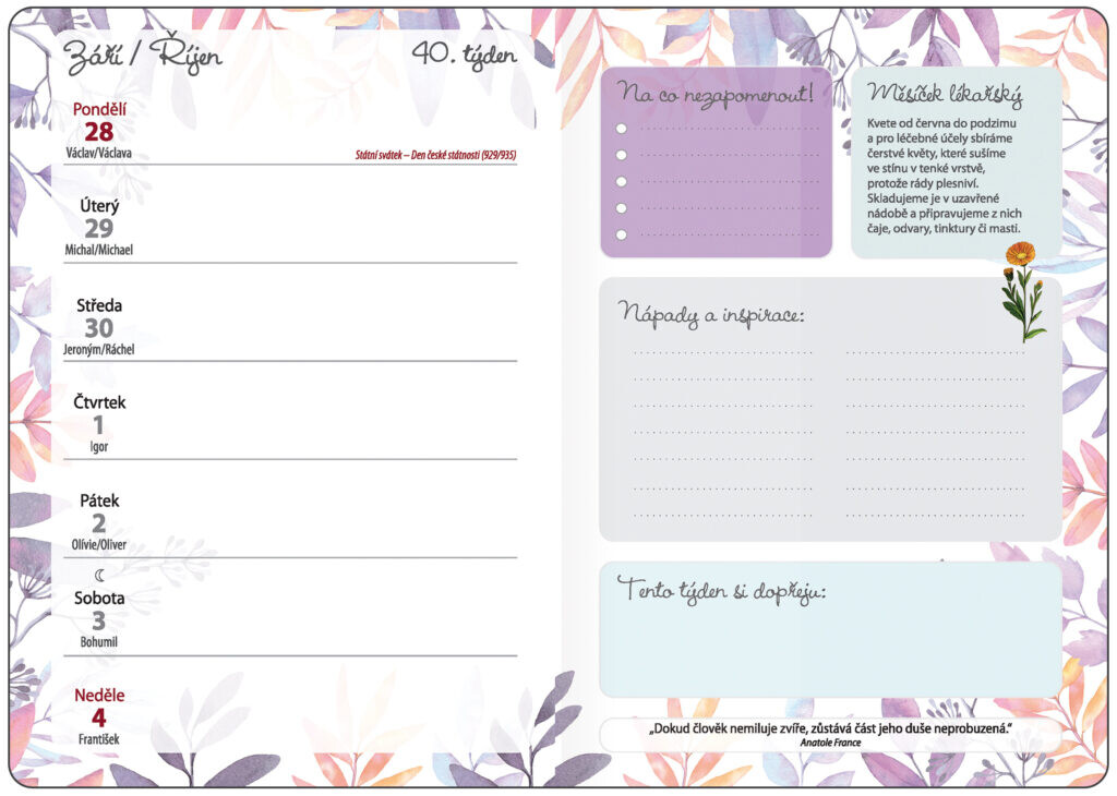 Elegantný farebný diár s popisom účinkov a použitia vybraných byliniek na každý mesiac, citátom na každý týždeň a priestorom na poznámky, nápady a inšpiráciu. Dosky sú vyrobené z matného lamina s obľúbeným hodvábnym povrchom soft touch. Diáre sú doplnené gumičkou cez chrbát, záložkou a troma aršíkmi kreatívnych samolepiek.