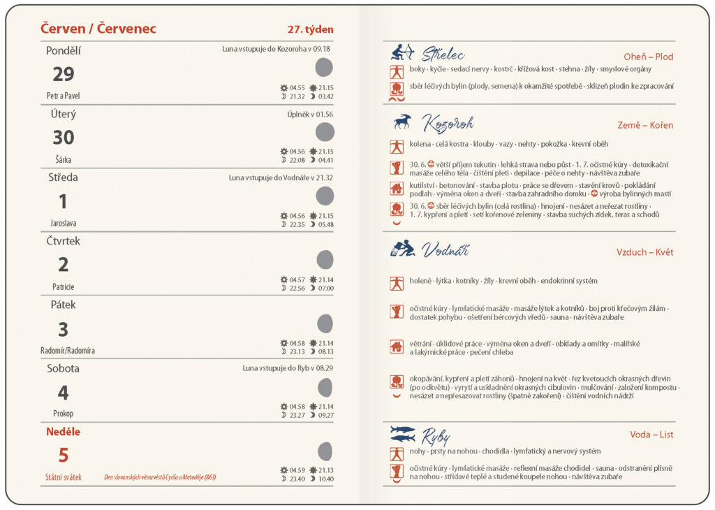 Diár orientovaný na praktické rady, podľa ktorých sa môžete riadiť počas lunárneho cyklu as informáciami týkajúcimi sa starostlivosti o telo, domácnosť, majstrovanie a záhradu. Dosky sú vyrobené z matného lamina s obľúbeným hodvábnym povrchom soft touch. Diáre sú doplnené gumičkou cez chrbát, záložkou a troma aršíkmi kreatívnych samolepiek.