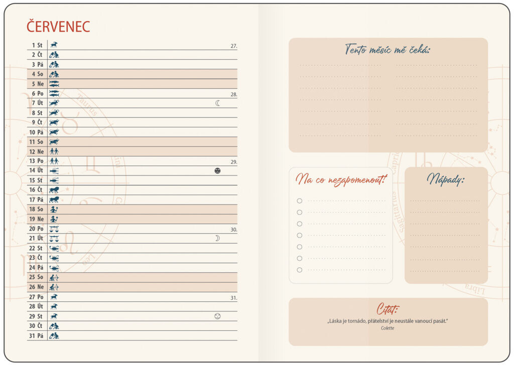 Kalendárium: české týždenné + papier bloku chamois + 3x kreatívne samolepky