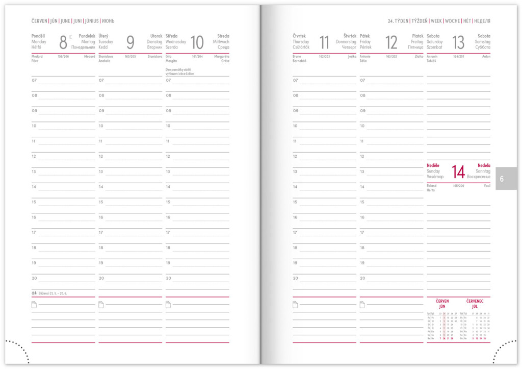 Týždenný rozvrh s česko-slovenským kalendáriom a doplnkovou angličtinou, nemčinou, maďarčinou a ruštinou.