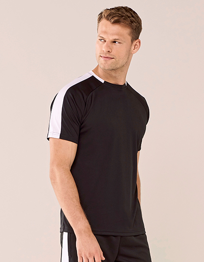 Jednoduchý džersej. Unisex. Kontrastné farebné rukávové panely z rovnakej látky. Športové fit. Wicking povrch zaisťuje odvod vlhkosti. Rýchlo suché a priedušné. Dvojdielny golier z rovnakej látky. Raglánové ramená. Odtrhávací štítok.