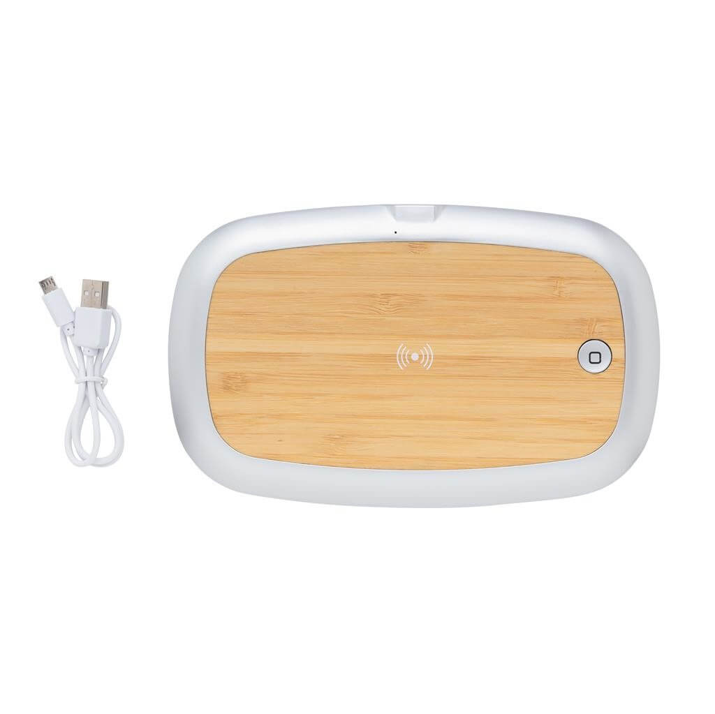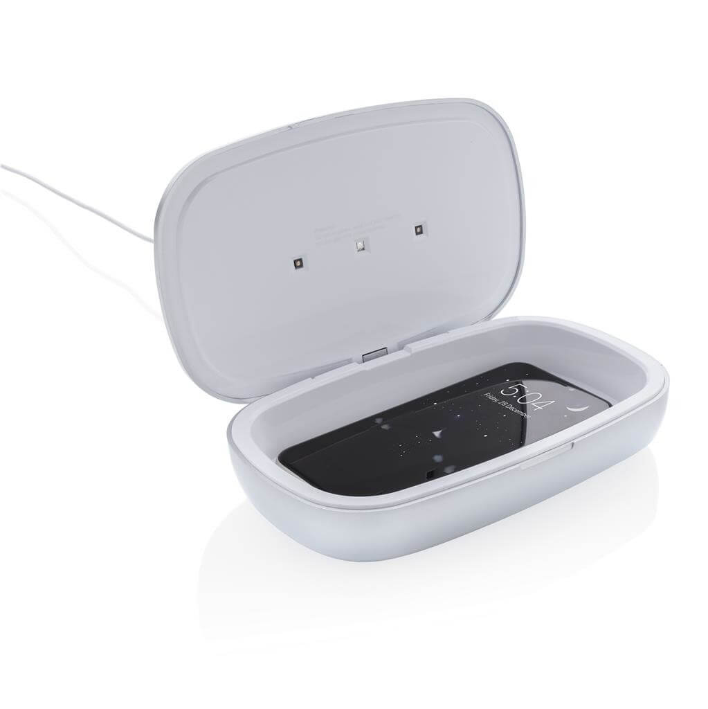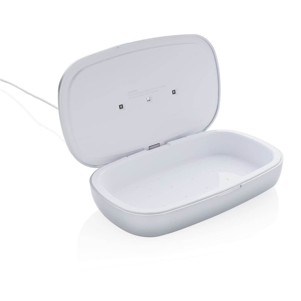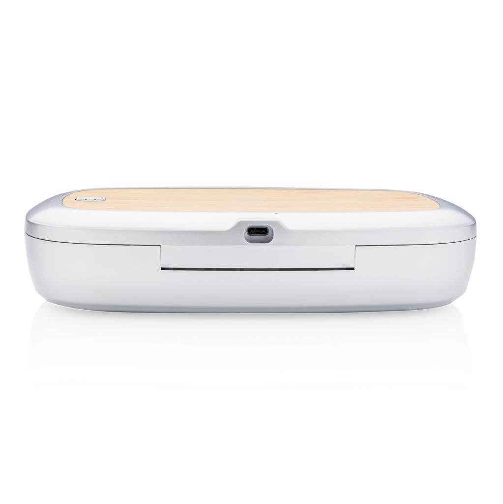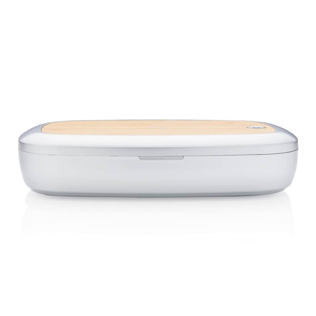 Multifunkčný UV-C sterilizátor, ktorý zabíja až 99,9% baktérií na vloženom predmetu. Vhodné napríklad na telefón, slúchadlá, hodinky, šperky alebo rúško. Voliť možno medzi režimami rýchleho čistenia (90s) alebo kompletného čistenie (5min). 2 UV-C LED svetla, vyrobená z netoxického materiálu bez použitia ortuti (veľa dostupných variantov na trhu ortuť obsahujú). Navrhnuté tak, aby sa pri otvorení boxu UV-C svetlo automaticky zhaslo a užívateľ tak nebol vystavený jeho žiarenia. Svetlo má životnosť 10 000 hodín. Bezdrôtová nabíjačka 5W umiestnená na hornej strane boxu. Vrátane 1m USB C káblu z TPE (PVC free). Vstup: 5V / 1,5A. Výstup: 5V / 1A 5W. Vlnová dĺžka UV-C svetla: 270N-280Nm.