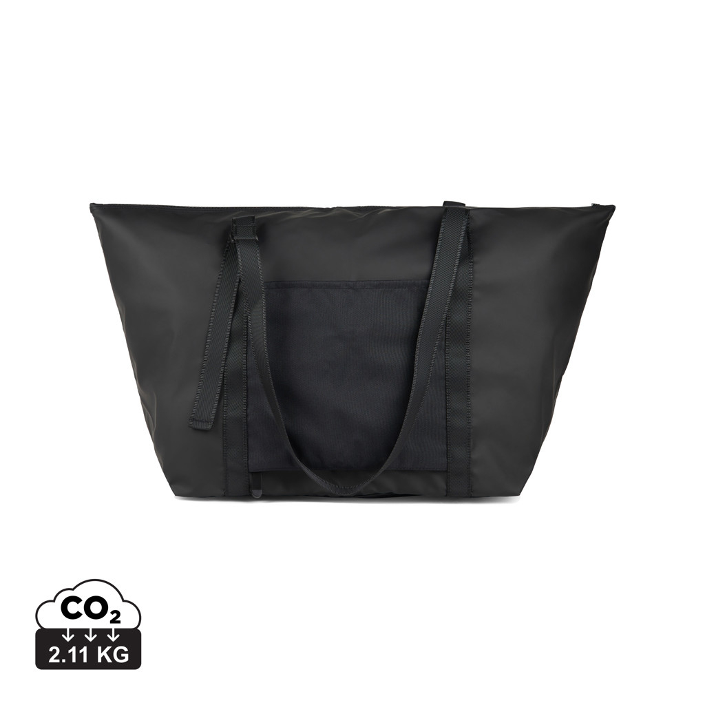 Víkendová taška vyrobená z ľahkého recyklovaného polyesteru s modernou PU povrchovou úpravou. Chytrá gumička a spona pre efektívne zloženie a ľahký prenos. Prispôsobiteľné popruhy na nosenie v ruke alebo na ramene. Praktické vonkajšie vrecko, ktoré je možné premeniť na popruh na madlo kufra pre pohodlné cestovanie bez extra závažia. Vyrobené z GRS recyklovaného polyesteru. GRS (Global Recycle Standard) je globálny štandard, ktorý umožňuje overiť použitie recyklovaného materiálu v produkte naprieč celým dodávateľským reťazcom. Celkový podiel recyklátu podľa váhy produktu: 52%.