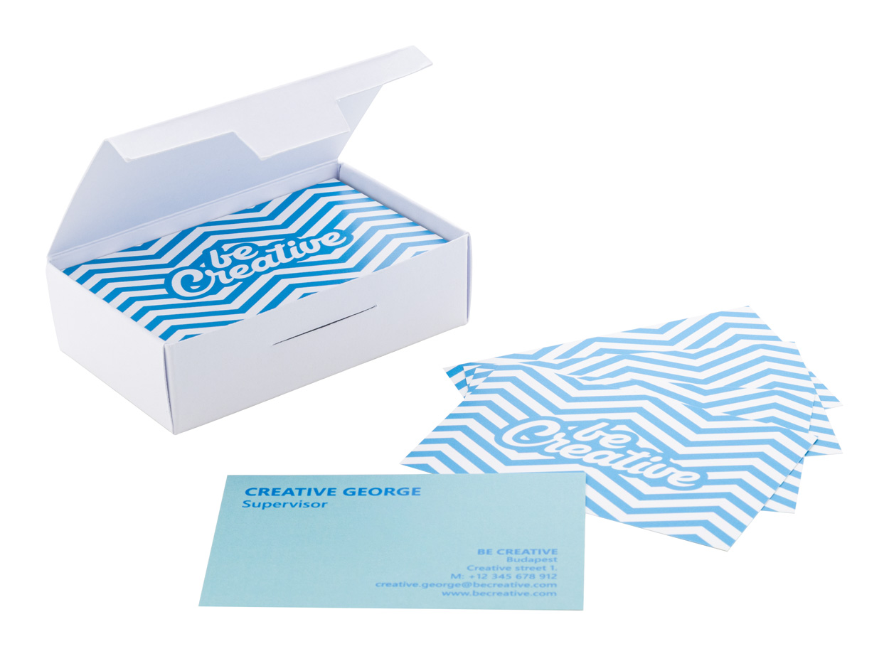 100 ks vizitiek z papiera odolného proti roztrhnutiu, vyrobených na zákazku, s plnofarebnou grafickou potlačou na oboch stranách, cena nezahŕňa tlačovú prípravu. V bielej papierovej krabičke. Uvedená cena sa vzťahuje na jednu krabičku vizitiek obsahujúcu 100 ks.