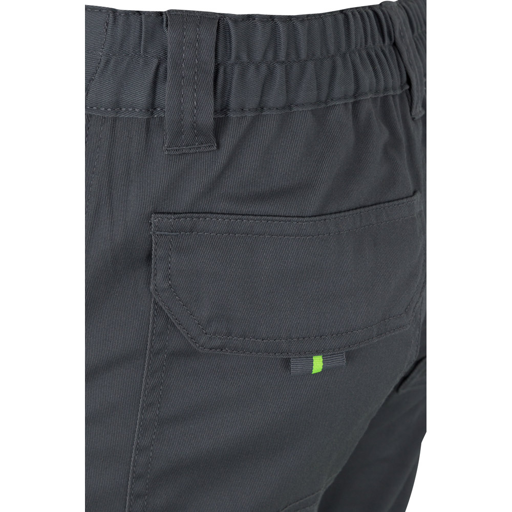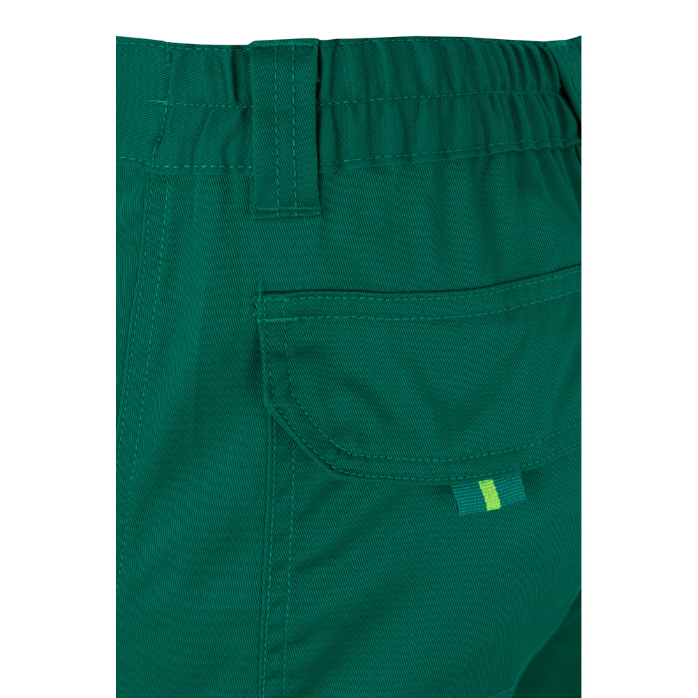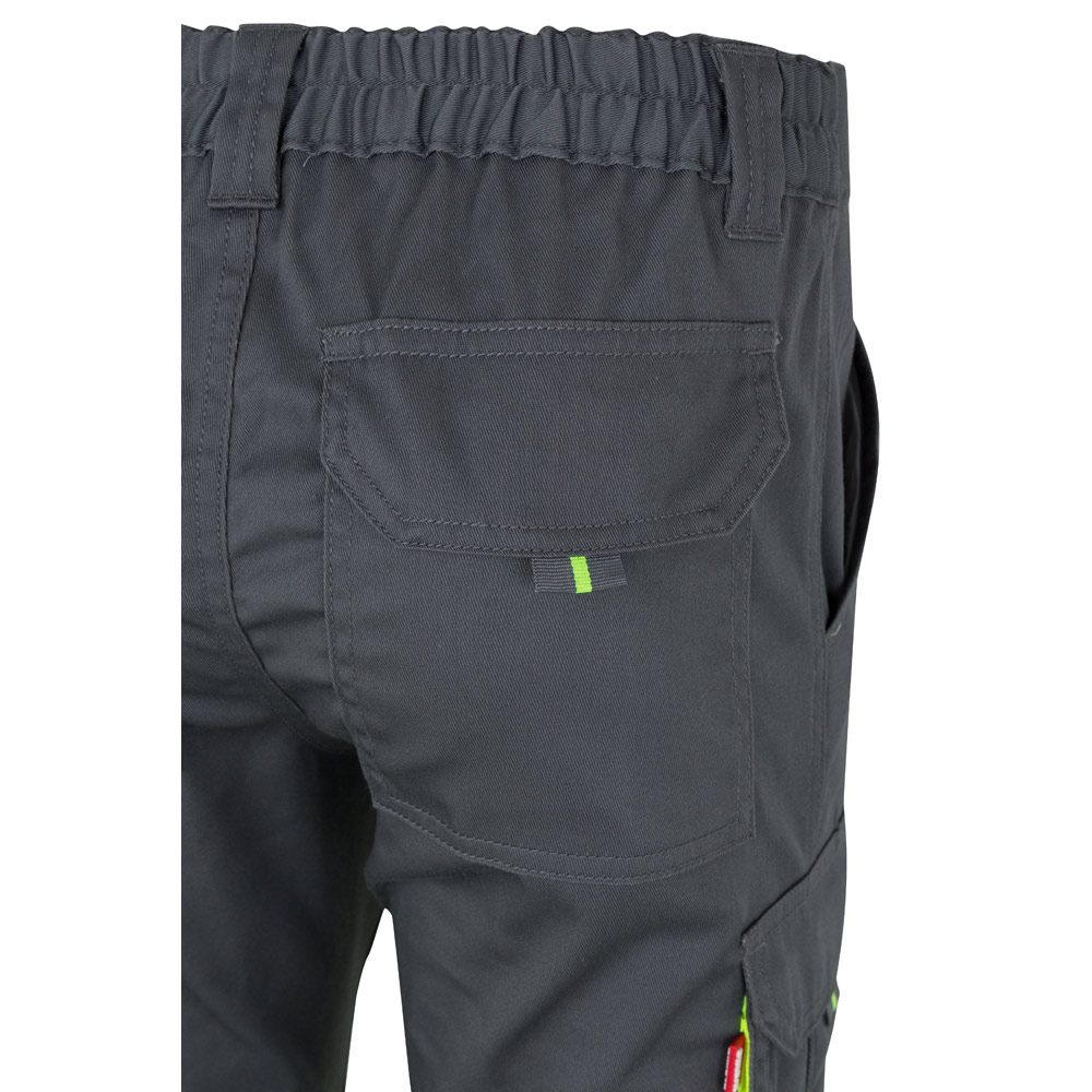 Dvojfarebné strečové nohavice s viacerými vreckami (240 g/m²), z bavlny (46%), EME (38%) a polyesteru (16%). S elastickým pásom a reflexnými pruhmi na spodnej časti nohavíc. Kontrastná farba na mechoch, sťahovačoch a látke medzi reflexnými pruhmi Šesť vreciek (2 francúzske, 2 bočné a 2 zadné). Výrobok v súlade s EU Reg. 2016/425, certifikovaný EN20471 a trieda č. 1. Veľkosť: 4XL, 5XL