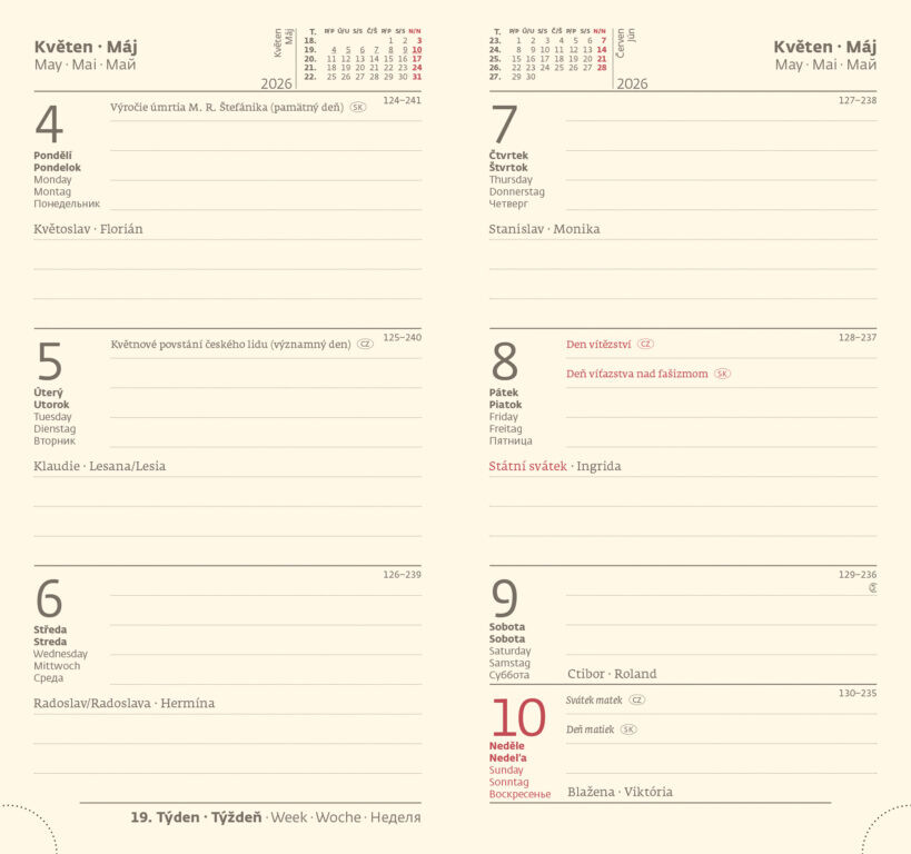 Diár obsahuje: osobné údaje, plánovač dovolenky (mesačný prehľad), plánovací kalendár, medzinárodné sviatky, ročný výhľad, týždenný layout, adresár