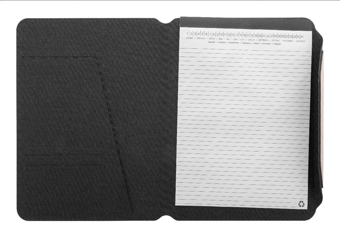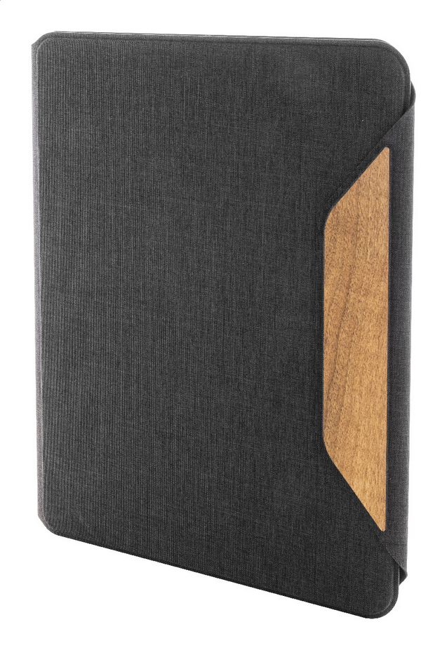 Zložka na dokumenty A4 z RPET polyesteru s niekoľkými vnútornými vreckami a magnetickým zapínaním s detailmi z orechového dreva. S linkovaným blokom z recyklovaného papiera s 20 listami. New. Go Green. Formát veľkosti: A4. Typ zošitového papiera: Linkované listy