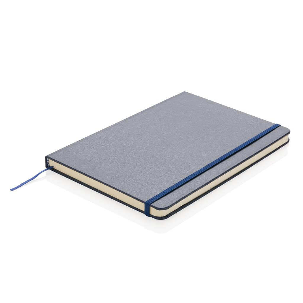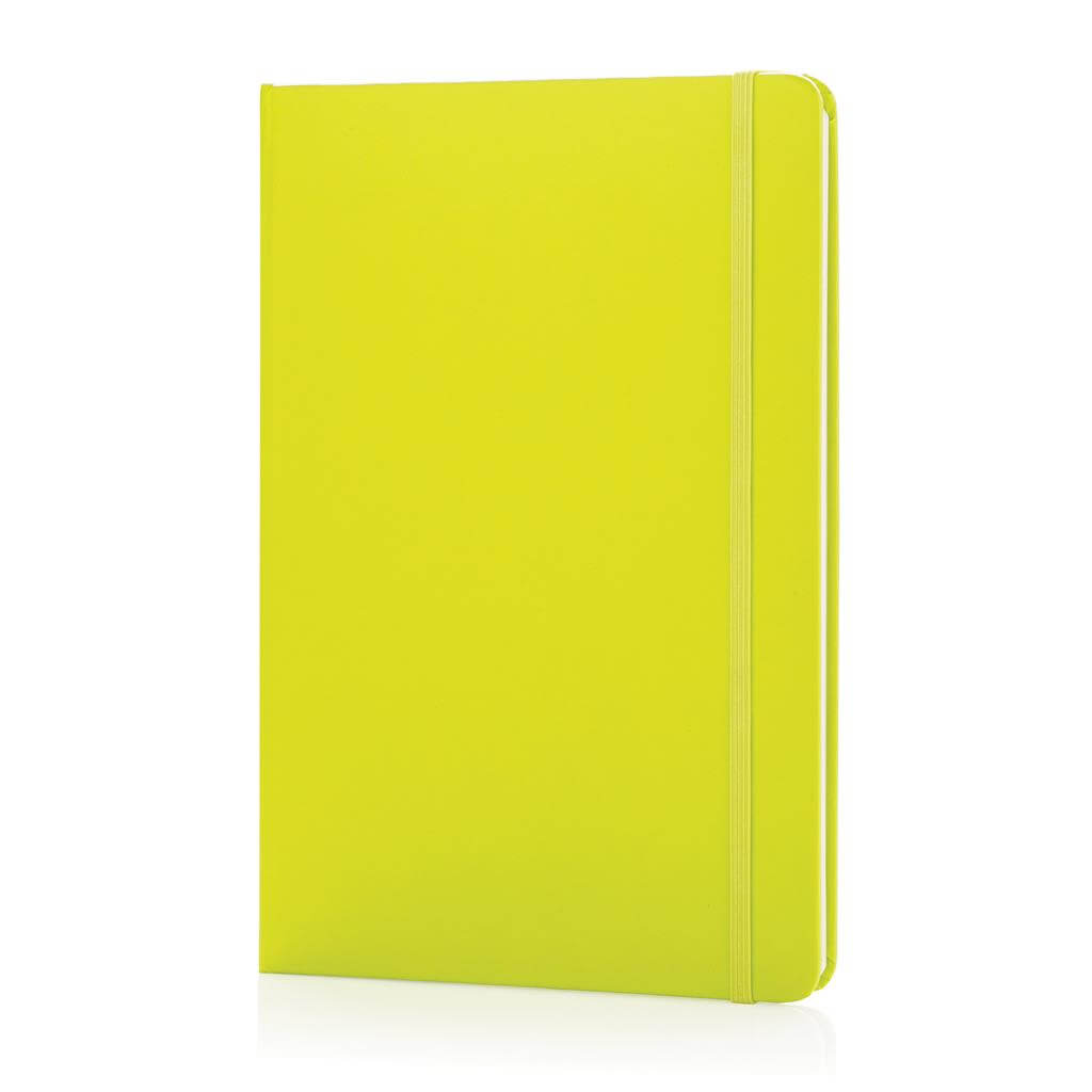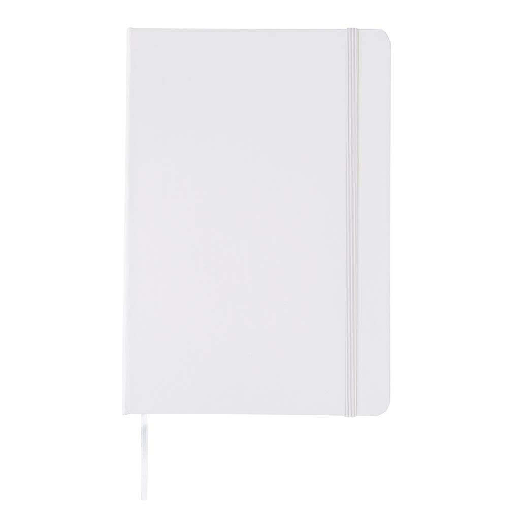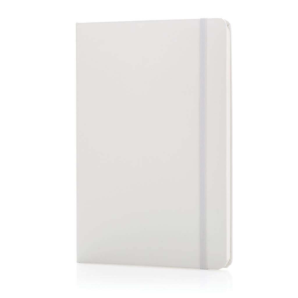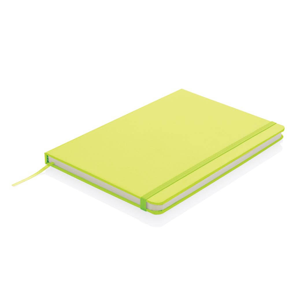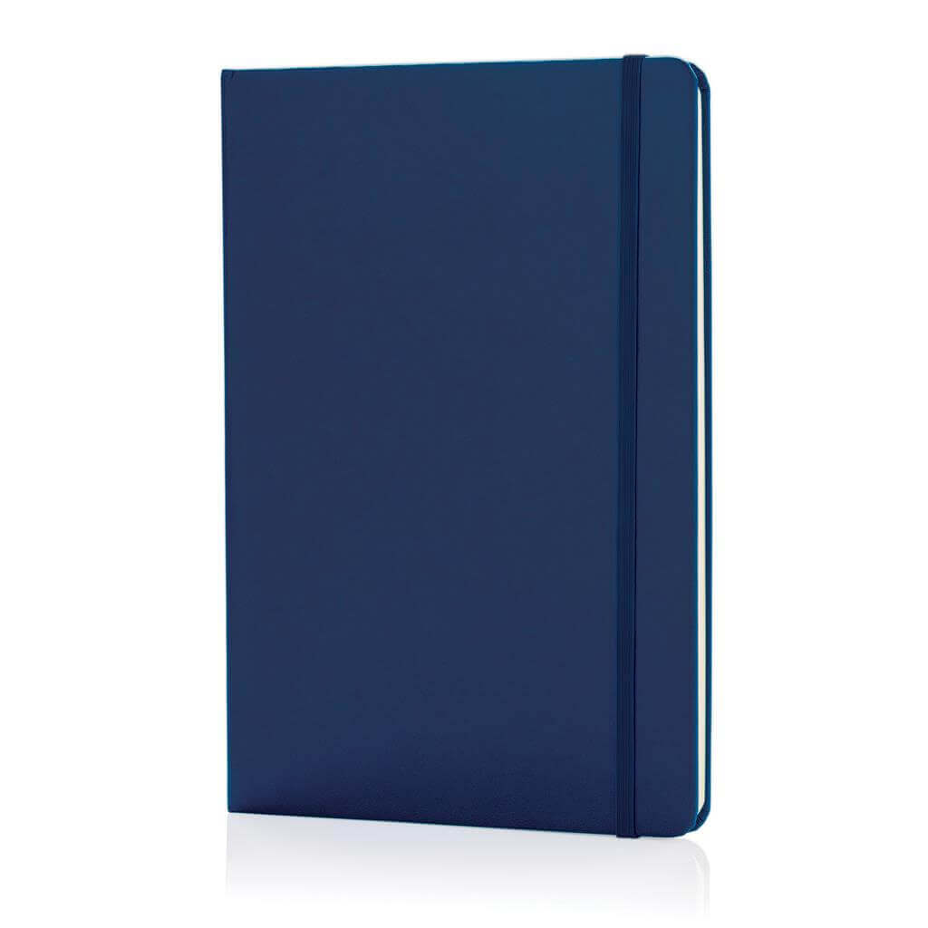 Linajkový základný poznámkový blok A5 s pevnými doskami s elastickým zatváraním a záložkou zo stuhy. 144 listov papiera s gramážou 70 g / m2. Krémové stránky.