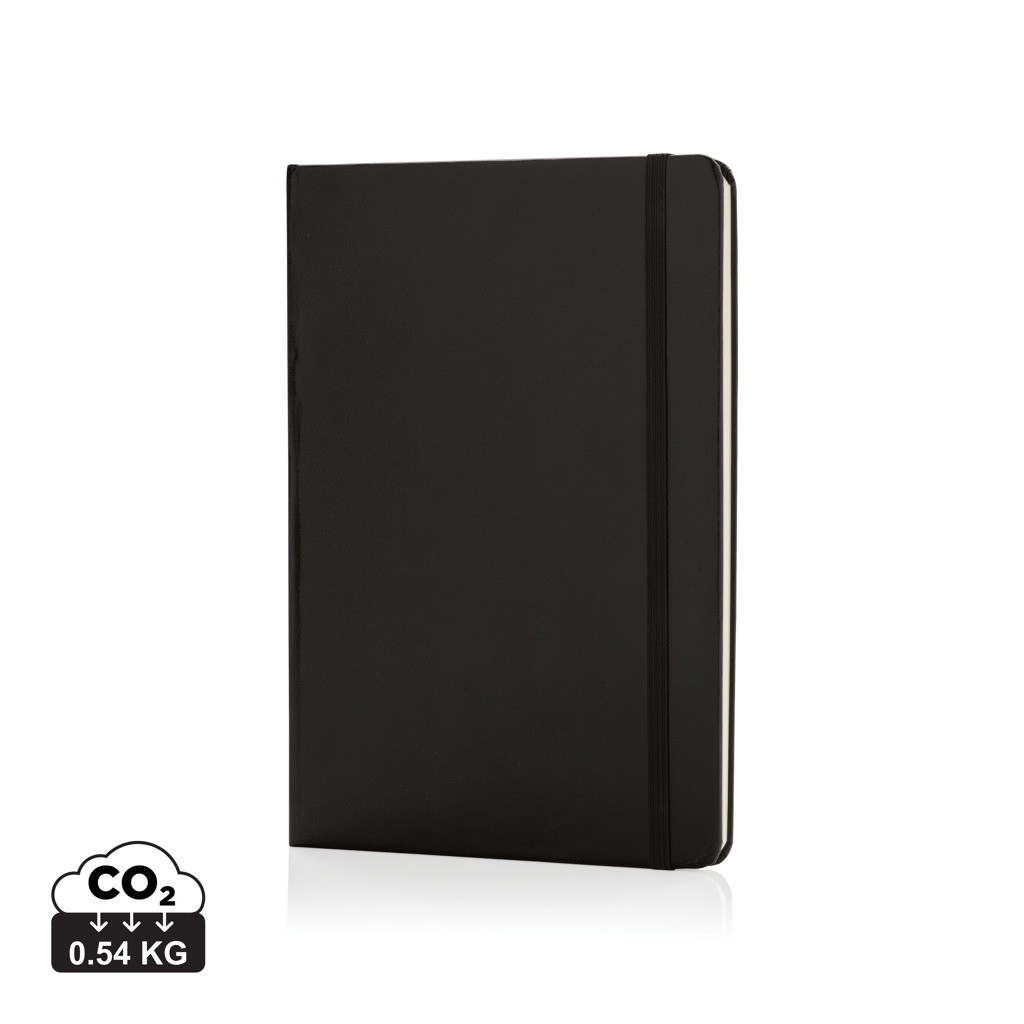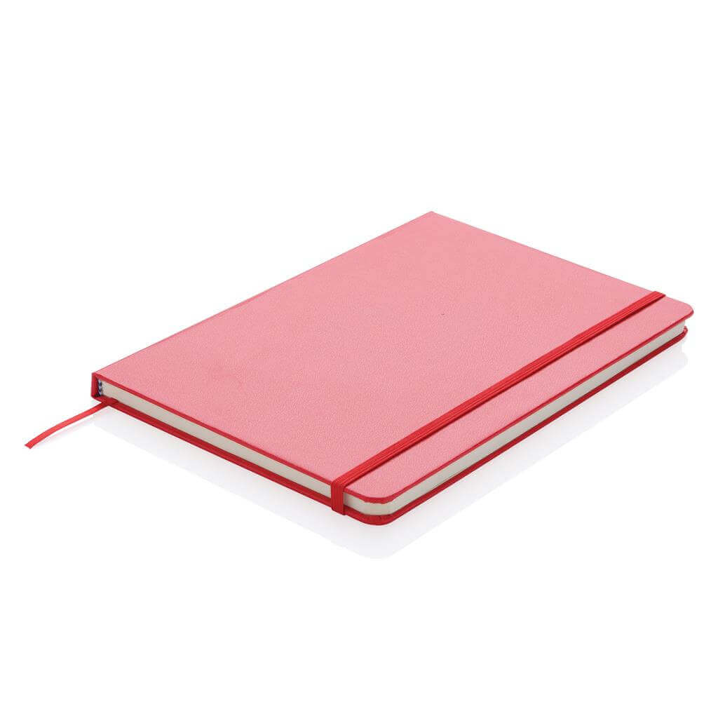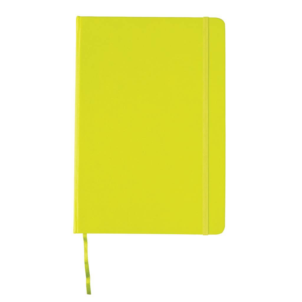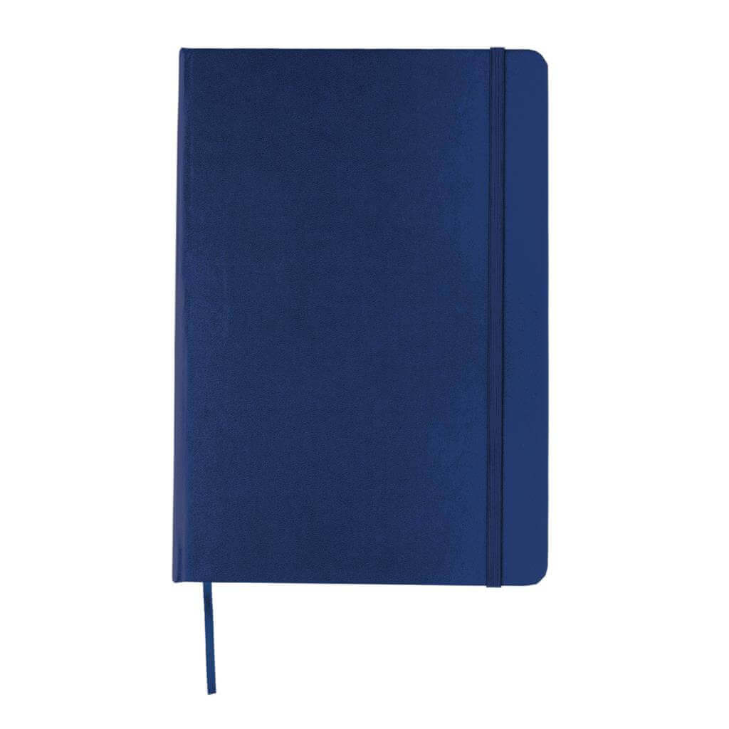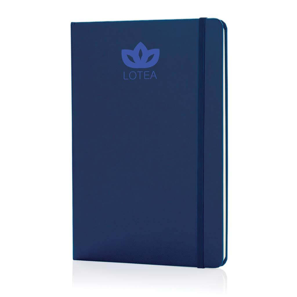 Linajkový základný poznámkový blok A5 s pevnými doskami s elastickým zatváraním a záložkou zo stuhy. 144 listov papiera s gramážou 70 g / m2. Krémové stránky.