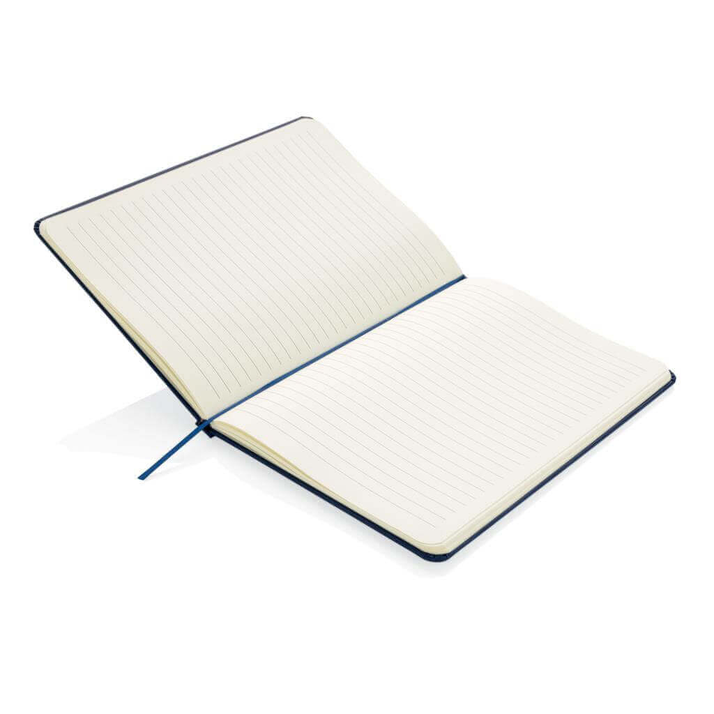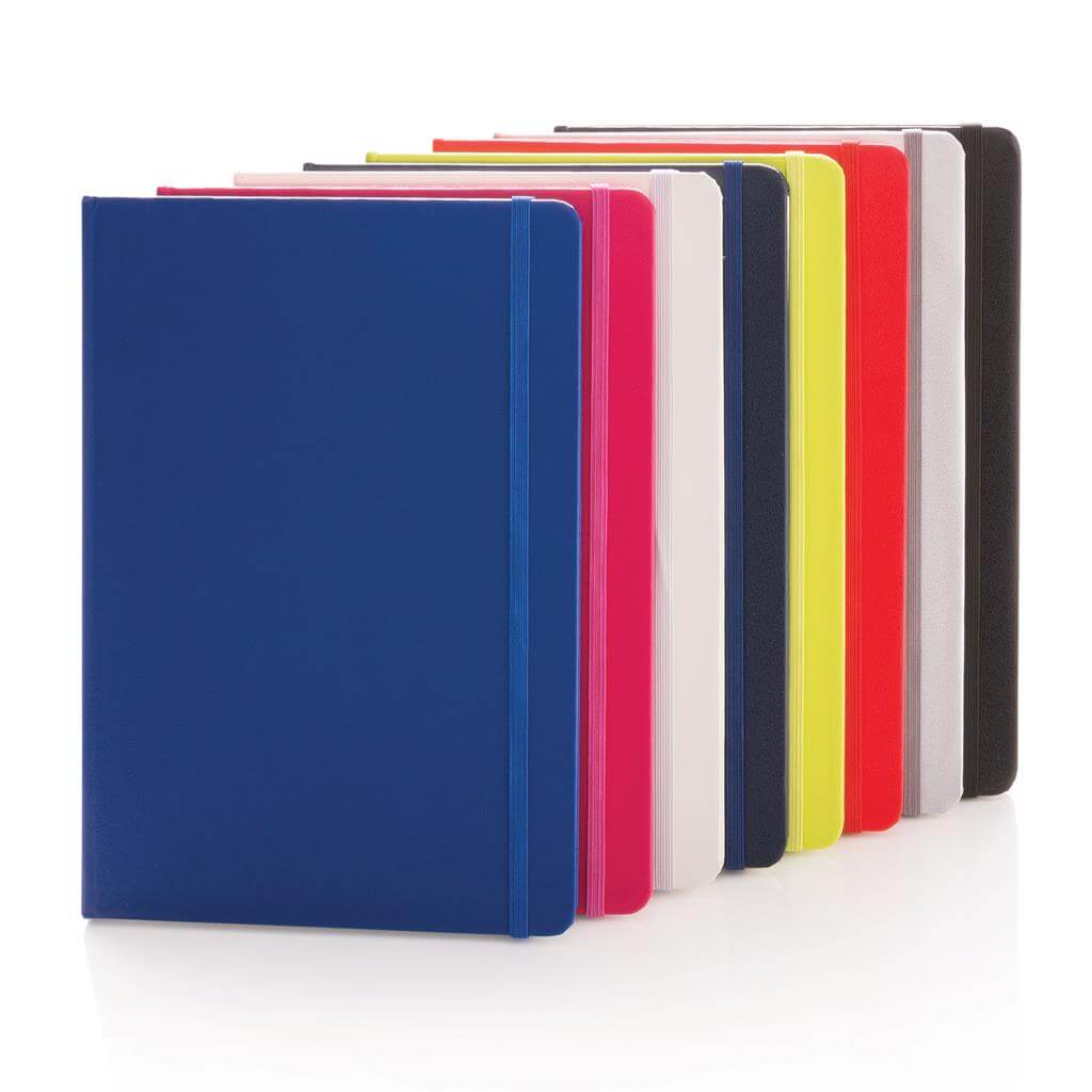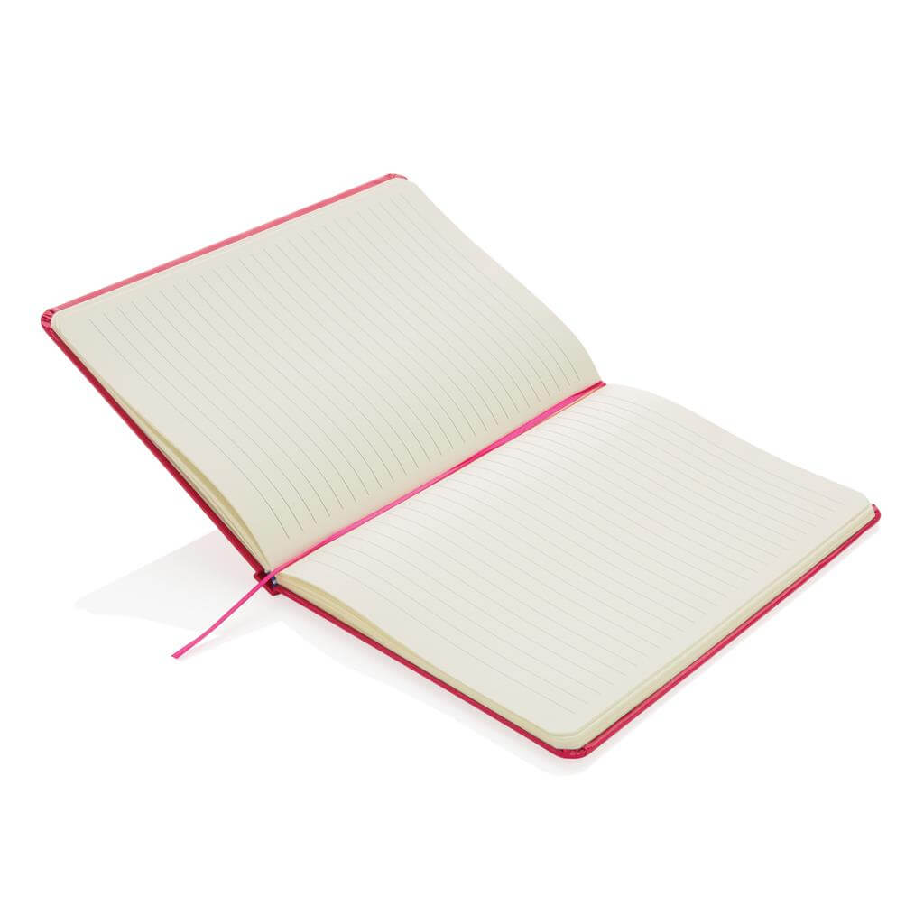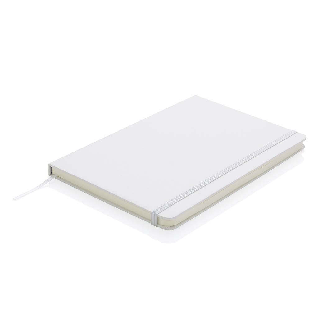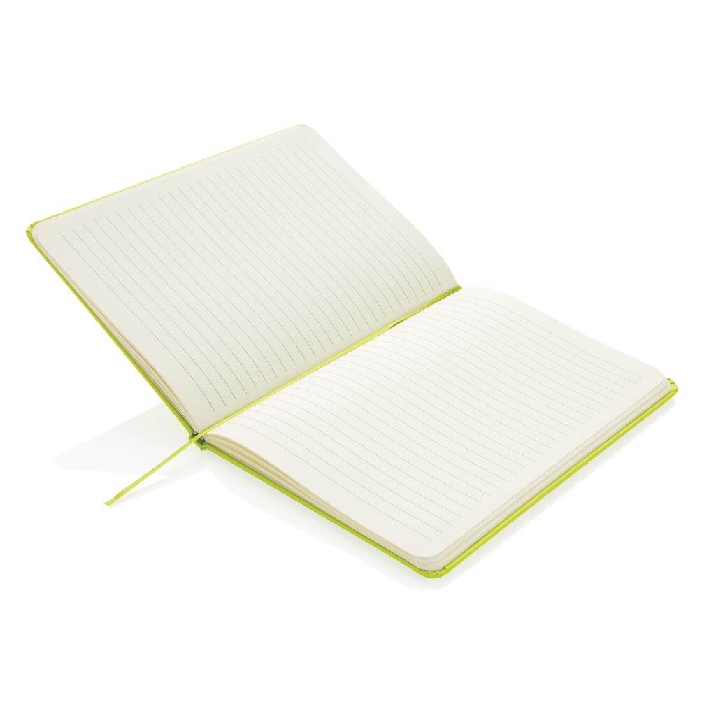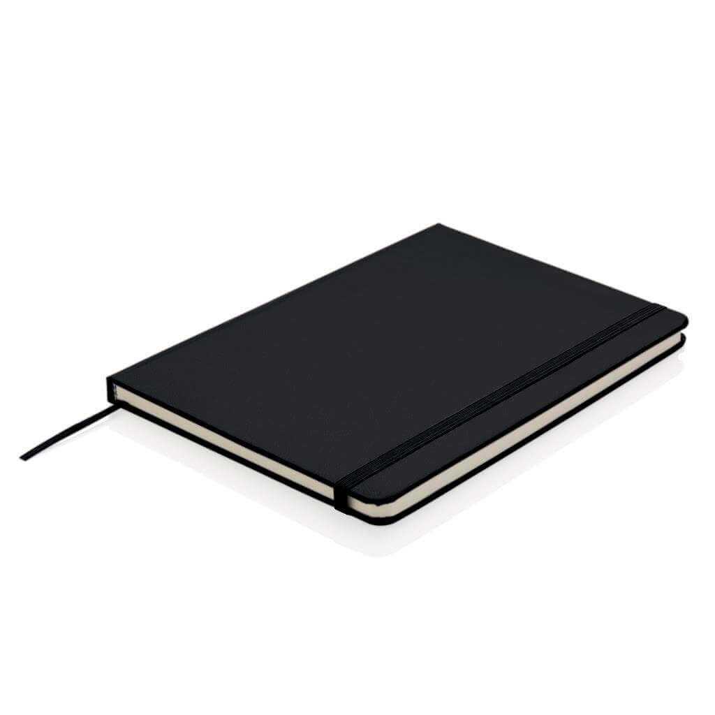 Linajkový základný poznámkový blok A5 s pevnými doskami s elastickým zatváraním a záložkou zo stuhy. 144 listov papiera s gramážou 70 g / m2. Krémové stránky.