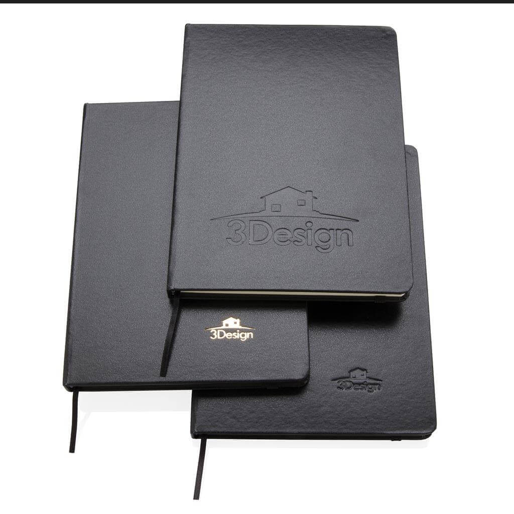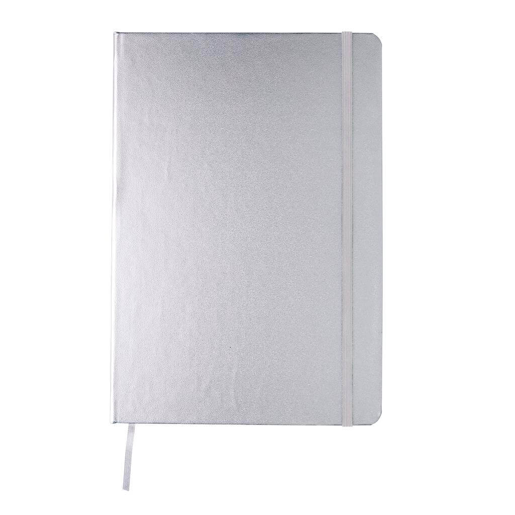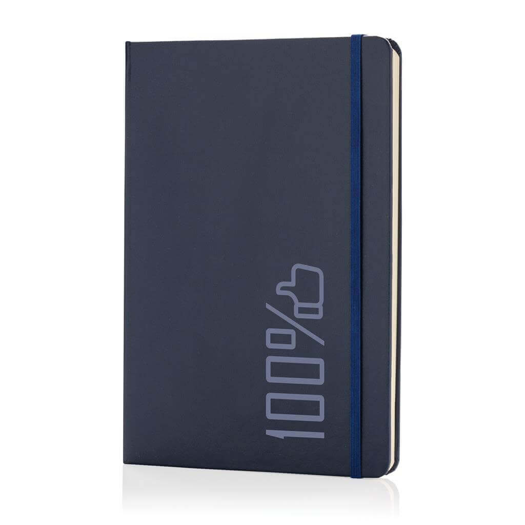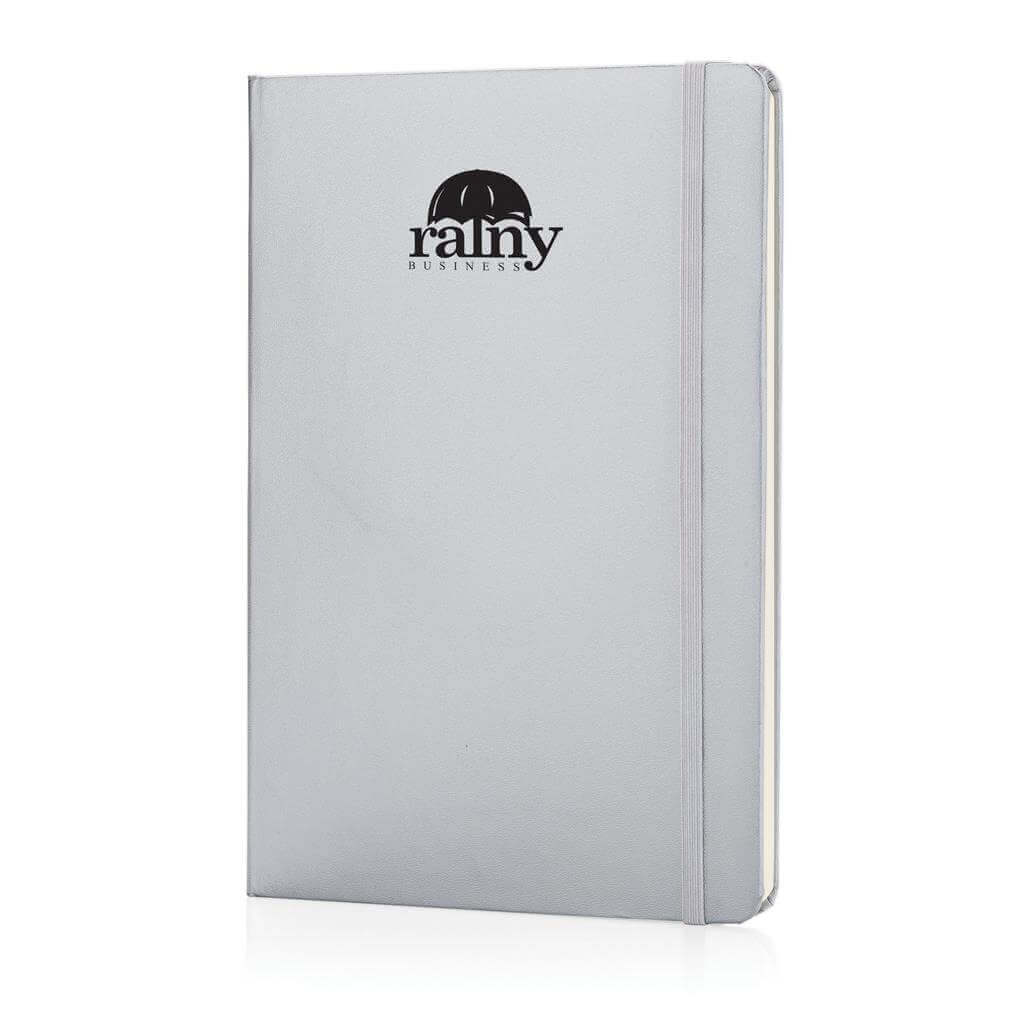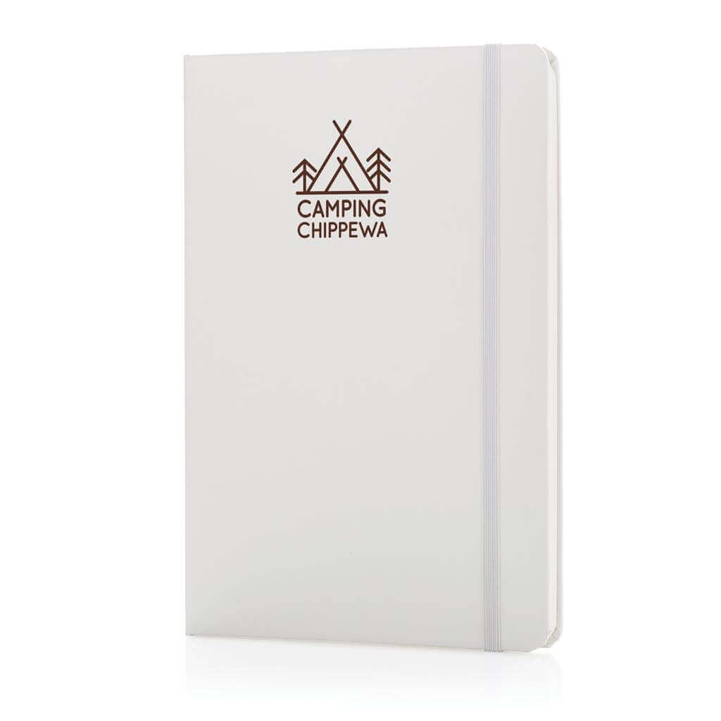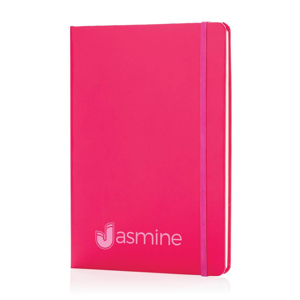 Linajkový základný poznámkový blok A5 s pevnými doskami s elastickým zatváraním a záložkou zo stuhy. 144 listov papiera s gramážou 70 g / m2. Krémové stránky.