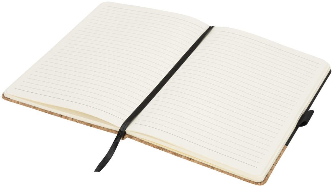 Zápisník Evora A5 z korku a materiálu Thermo PU. Štýlový zápisník v pevných doskách veľkosti A5 so spodným dielom z PU. Je vybavený elastickým uzáverom zhodné farby, stužkou na založenie stránky, 80 listy krémového linkovaného papiera (80 gsm) a rozkladacím vreckom na zadnej strane na uloženie malých poznámok. Balené v čiernej krabici. Korok a PU.