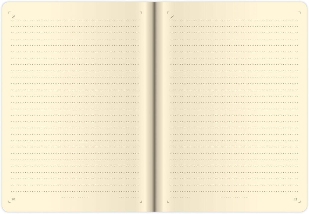 Dosky sú zhotovené z matného materiálu na báze zušľachteného papiera, ktorý je bez štruktúry. Tým neruší vzhľad samotného produktu. Zápisník je doplnen praktickou gumičkou na uzavretie a pútkom na pero. Kompletný dizajn dopľňa obšitie dosiek niťou. Do dosiek možno raziť cez fóliu, prípadne ich potlačiť sieťotlačou.